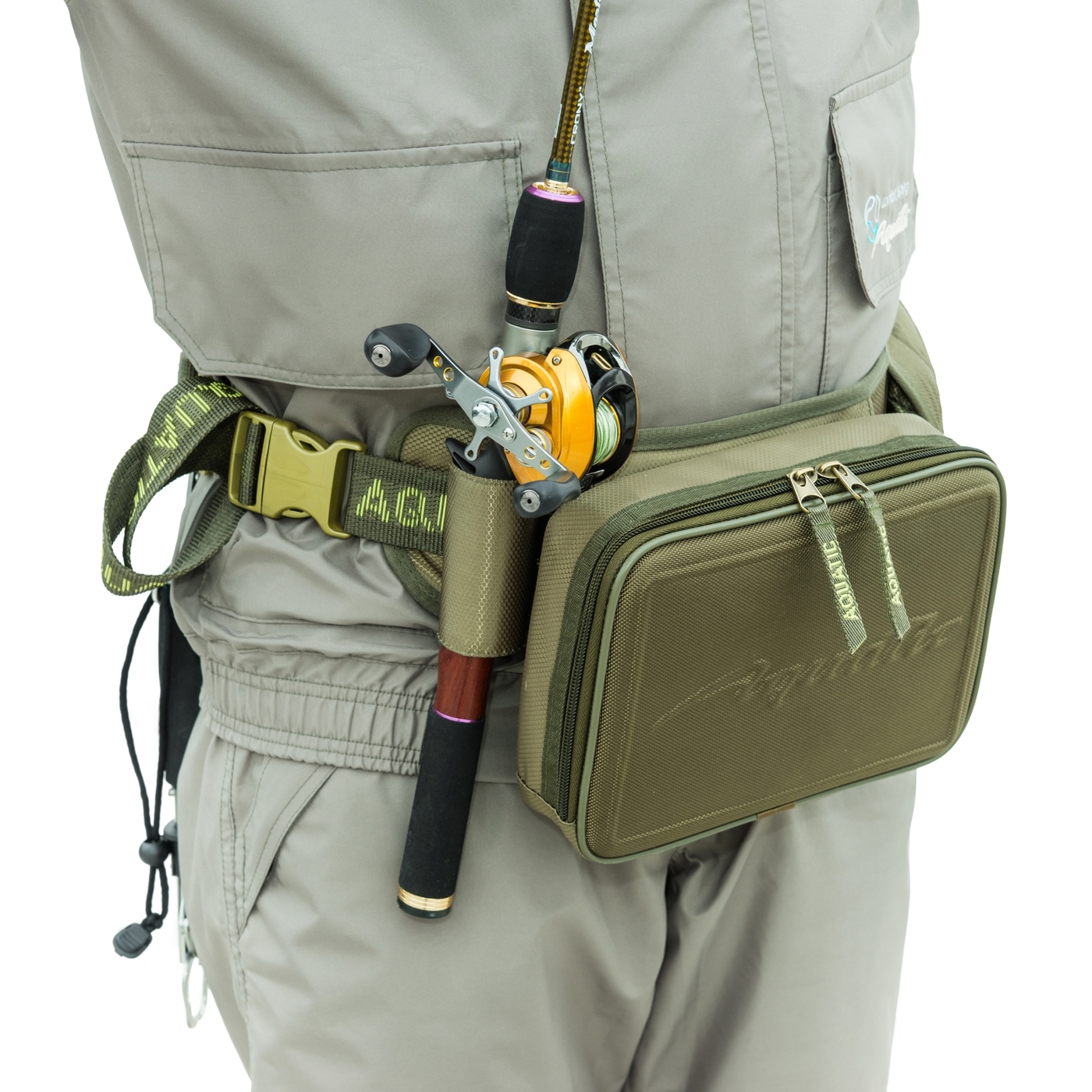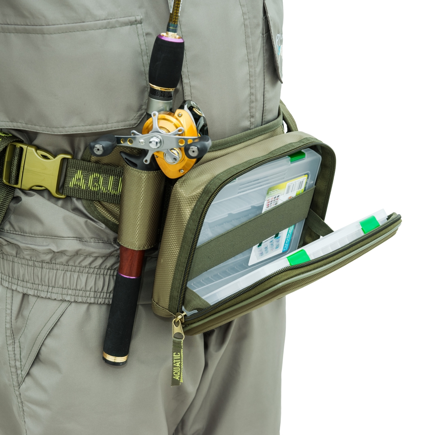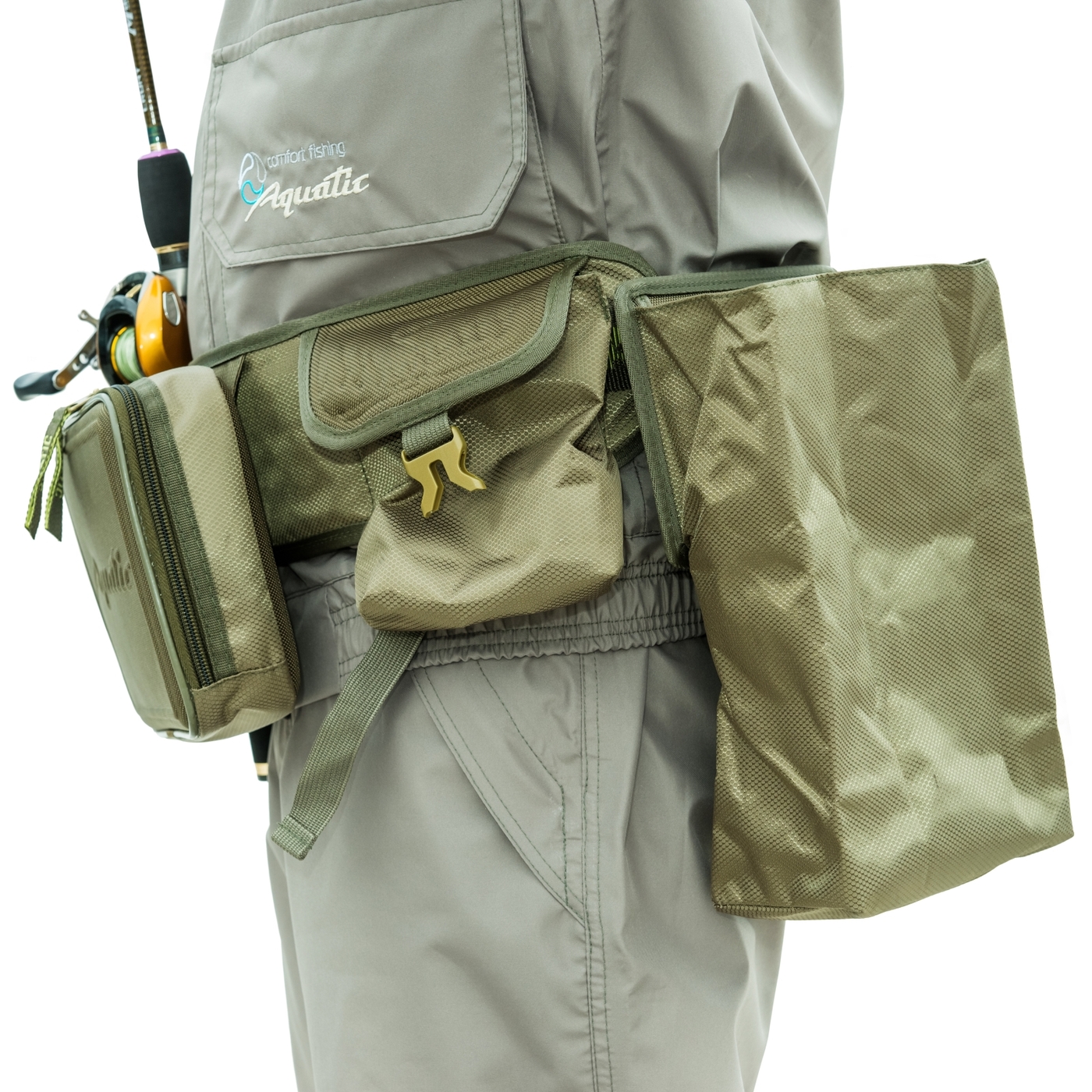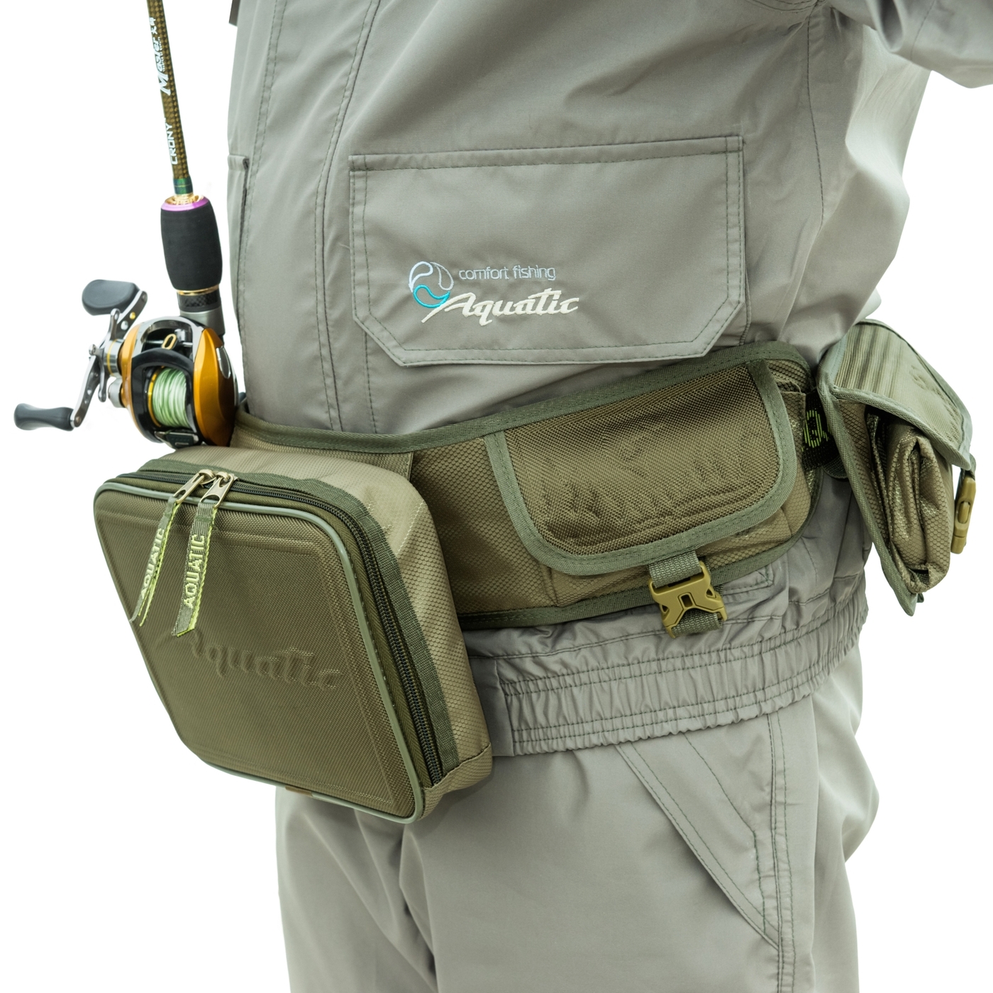 Разгрузочный пояс разработан для рыболовного туризма. Передний карман комплектуется коробками FB-220 (220x160x30 мм) 2 шт. В объёмный задний карман может поместиться куртка, термос или рыба до 2 килограмм.С помощью жёсткого стакана можно закрепить удилище