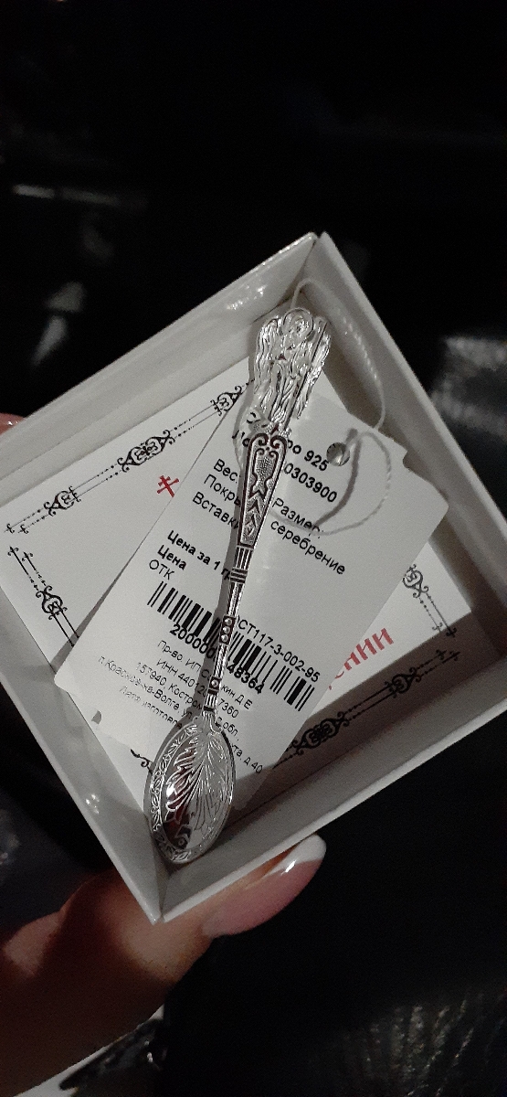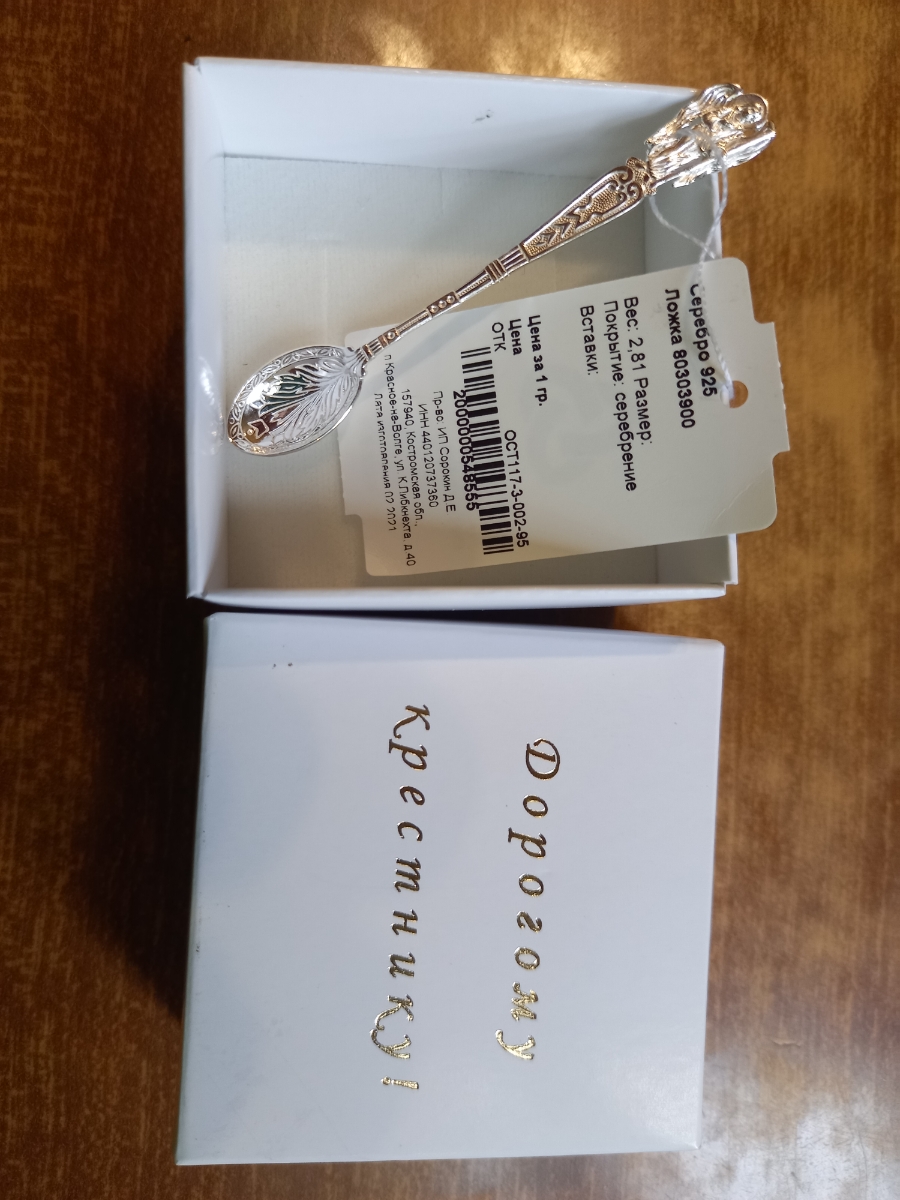 Комплектация:Ложка; 1 штука; подарочная коробкаОписание:Ложка серебряная сувенирная в подарок крестнику, длина 7 см. Поставляется в подарочной коробке. Освящена в храме Николая Чудотворца с. Сунгурово Костромской области.