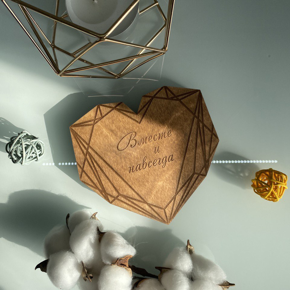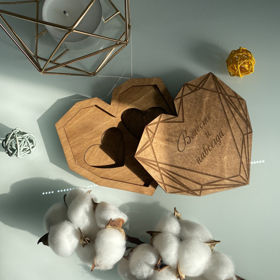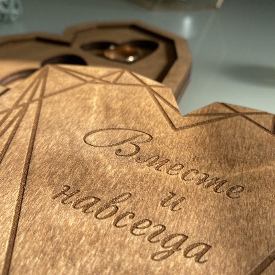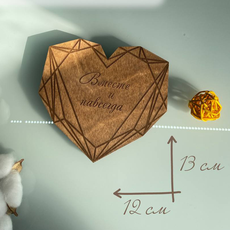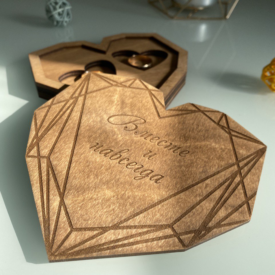 Шкатулка для свадебных колец с гравировкой на крышкой геометрического сердцаВыполнена из высококачественного дереваПокрытие безопасным маслом цвета орехРазмер шкатулки - 13х12х2 смМаксимальный размер кольца - 25х6 ммВнимание! Текстура и цвет древесины мог