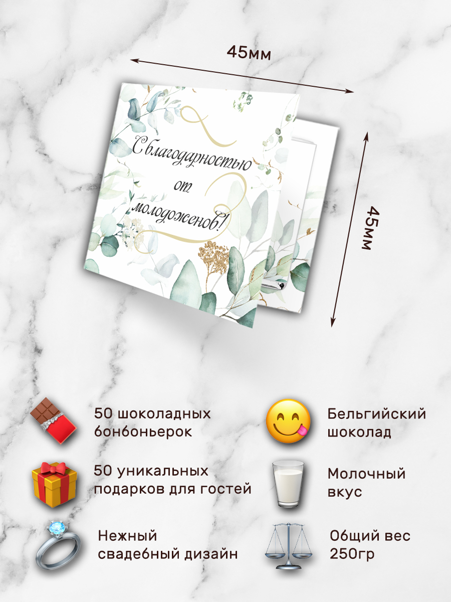 Набор свадебных бонбоньерок с шоколадкой для гостей – 50 шт. Открытка с шоколадкой станет отличным вариантом в качестве комплимента гостям по случаю завершения свадебного торжества. Каждая бонбоньерка состоит из плитки натурального бельгийского шоколада б