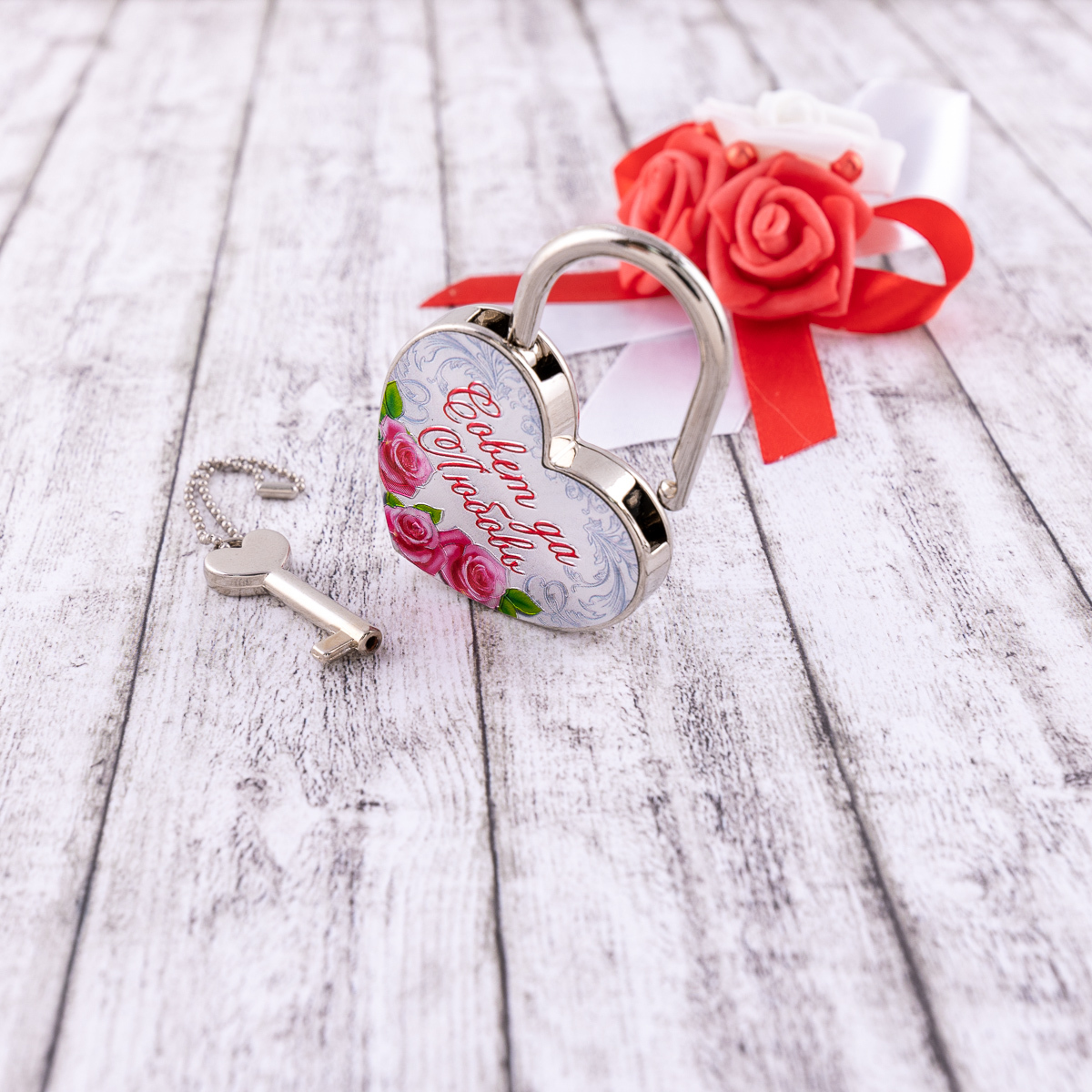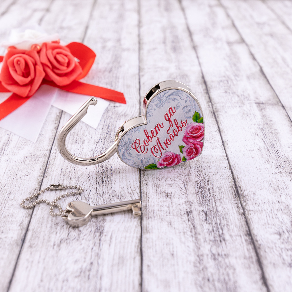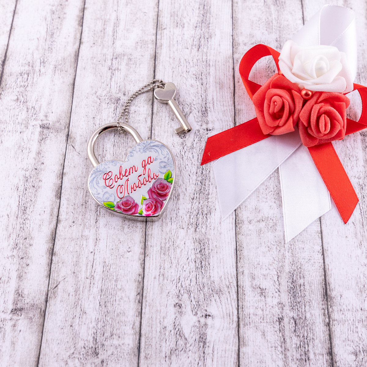 Замочек любви с розами "Совет да любовь" в форме сердца выполнен из серебристого металла с яркими акцентами. На передней поверхности выгравирована надпись красного цвета, а под ней — красивые розы в окружении зеленых листочков. Верхняя часть замочка декор