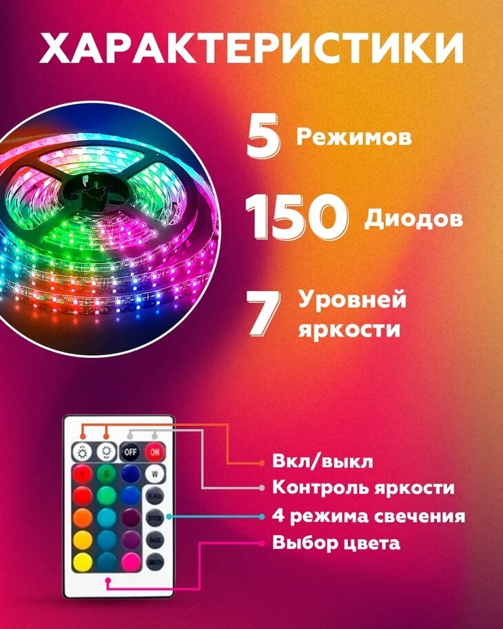 Цветная светодиодная лента с блоком питания и пультом управления идеально подходит как для домашнего, так и интерьерного освещения. Led лента влагостойкая, яркая, динамичная, практичная. Благодаря кристаллам, которые находятся в диоде, открываются безгран