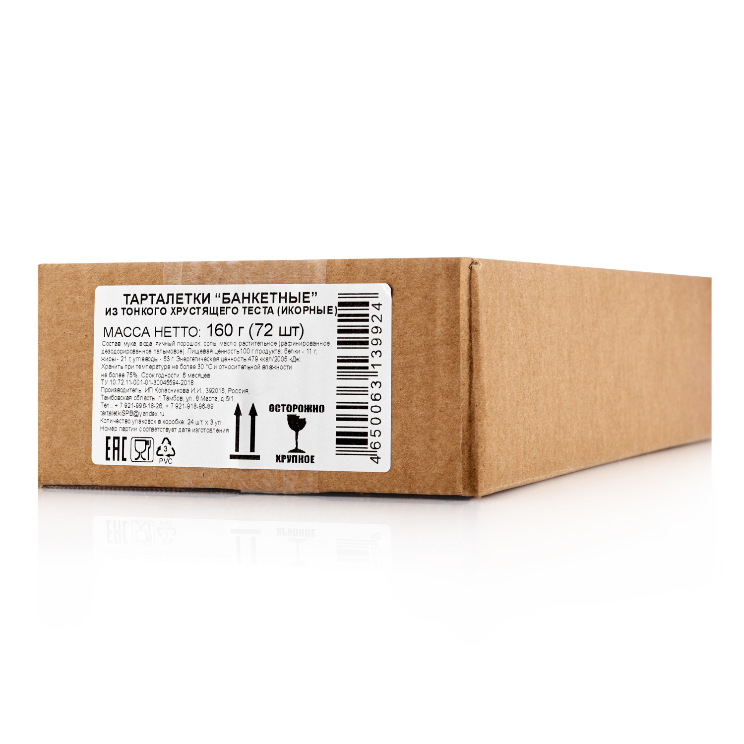 Условия хранения:хранить в сухих помещениях при отностительной влажности не более 75% и температуре не более 30ССостав:мука, вода, соль, яичный порошок, масло растительноеКомплектация:72шт.Описание:Тарталетки Икорные - подходят для наполнения икрой, и се