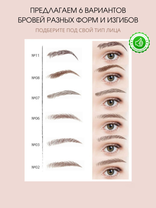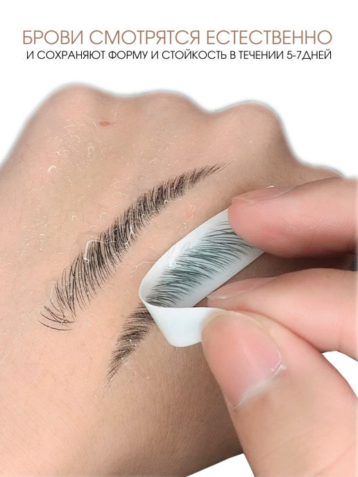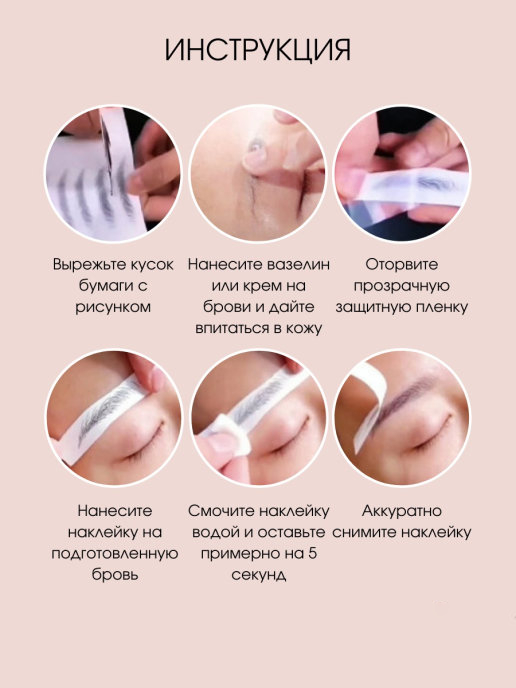 Способ примененияподготовьте брови: снимите макияж, обезжирьте область бровей. Вырежьте изображение как можно ближе к краям. Снимите прозрачную пленку и приложите изображение на область брови, прижав влажной салфеткой на 1 минуту. Осторожно удалите бумажную подложку и пер