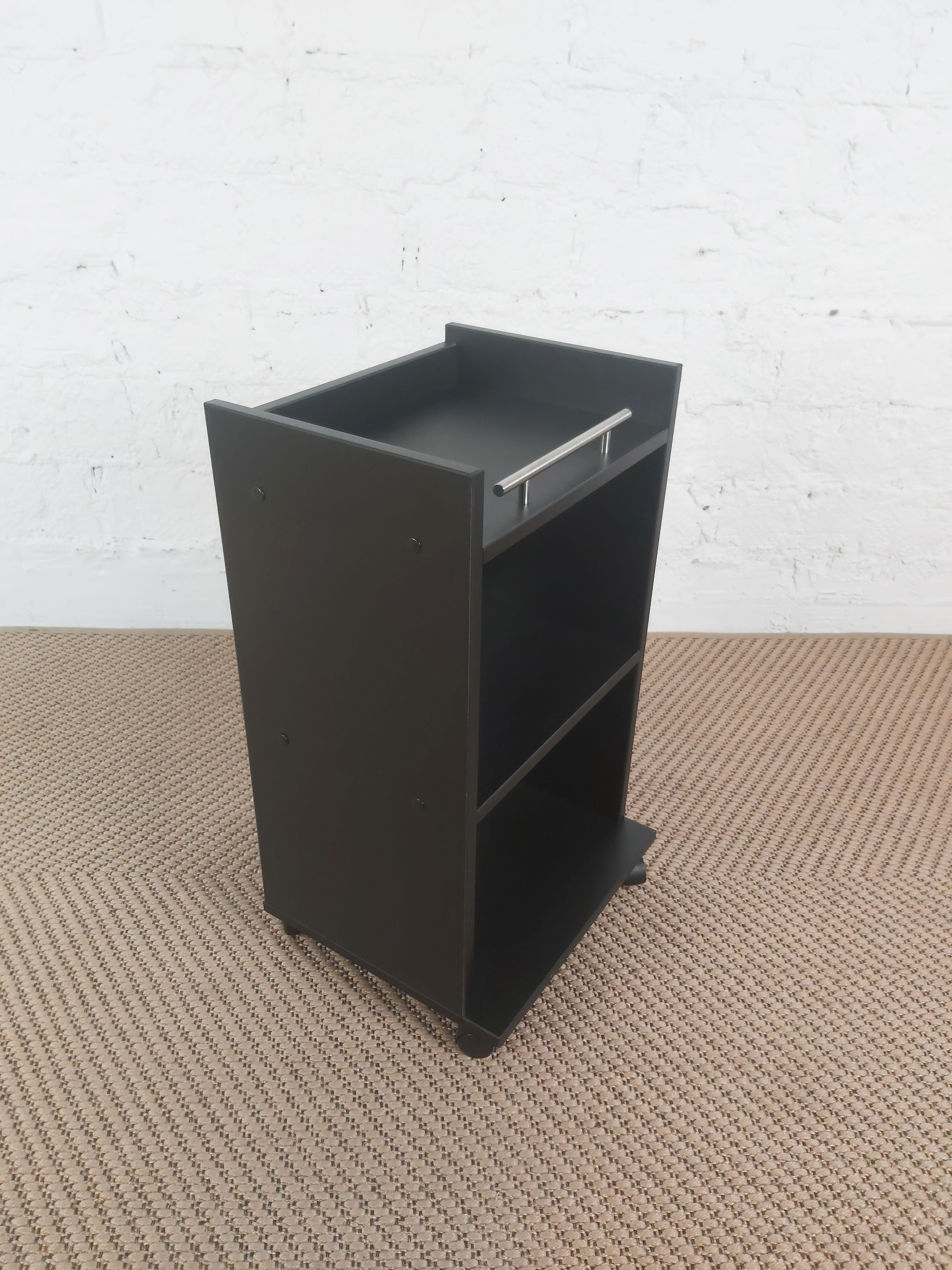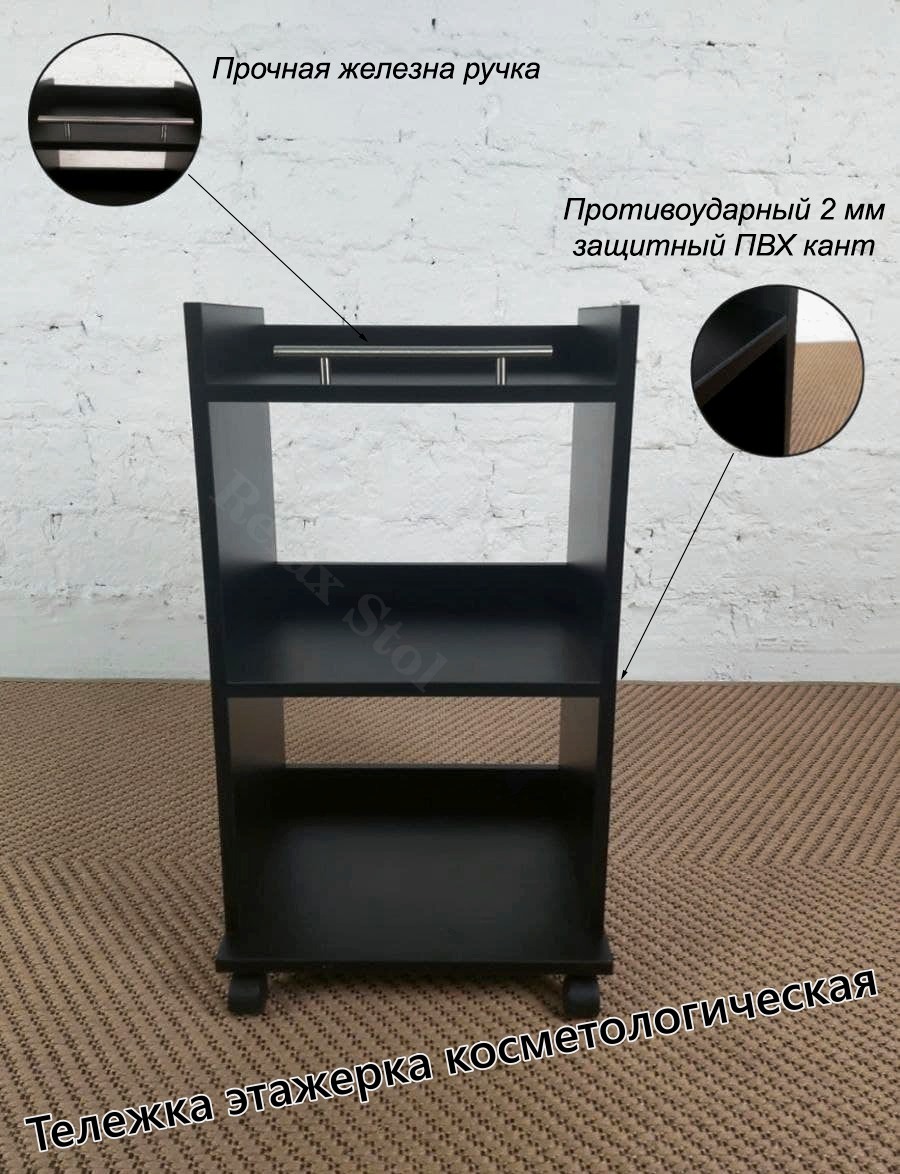 Косметологическая тележка этажерка из ламинированного ЛДСП с бортиками 5см, все торцы ЛДСП выполнены из ударопрочной, влагозащитной ПВХ кромкой толщиной 2мм, удобной металлической ручкой и колесиками для комфортного перемещения тележки. На всех наших теле