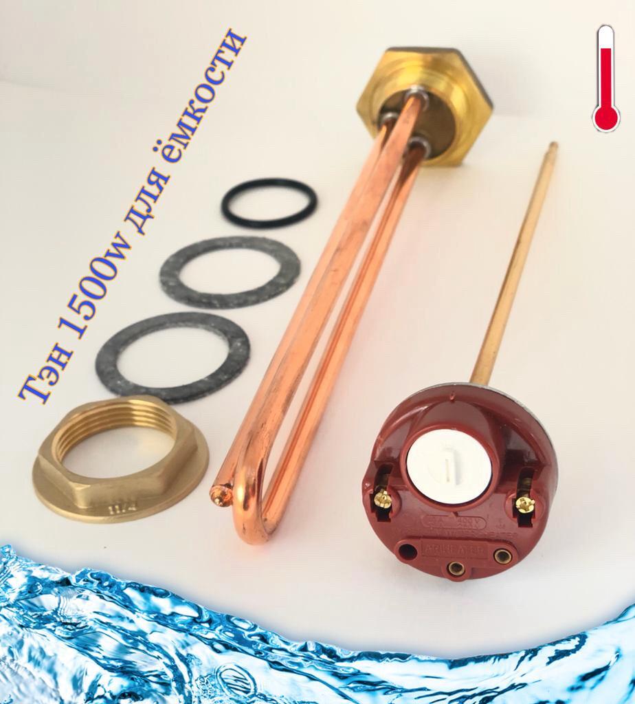 ТЭН 1500w для нагрева и поддержания температуры воды в металлических и пластиковых емкостях,Мощность: 1500WНапряжение: 220VВатная нагрузка на кв.см: 12,7WМатериал оболочки: МедьУстановочный габарит: 290 ммТип фланца: РезьбовойМатериал фланца: ЛатуньДиамет