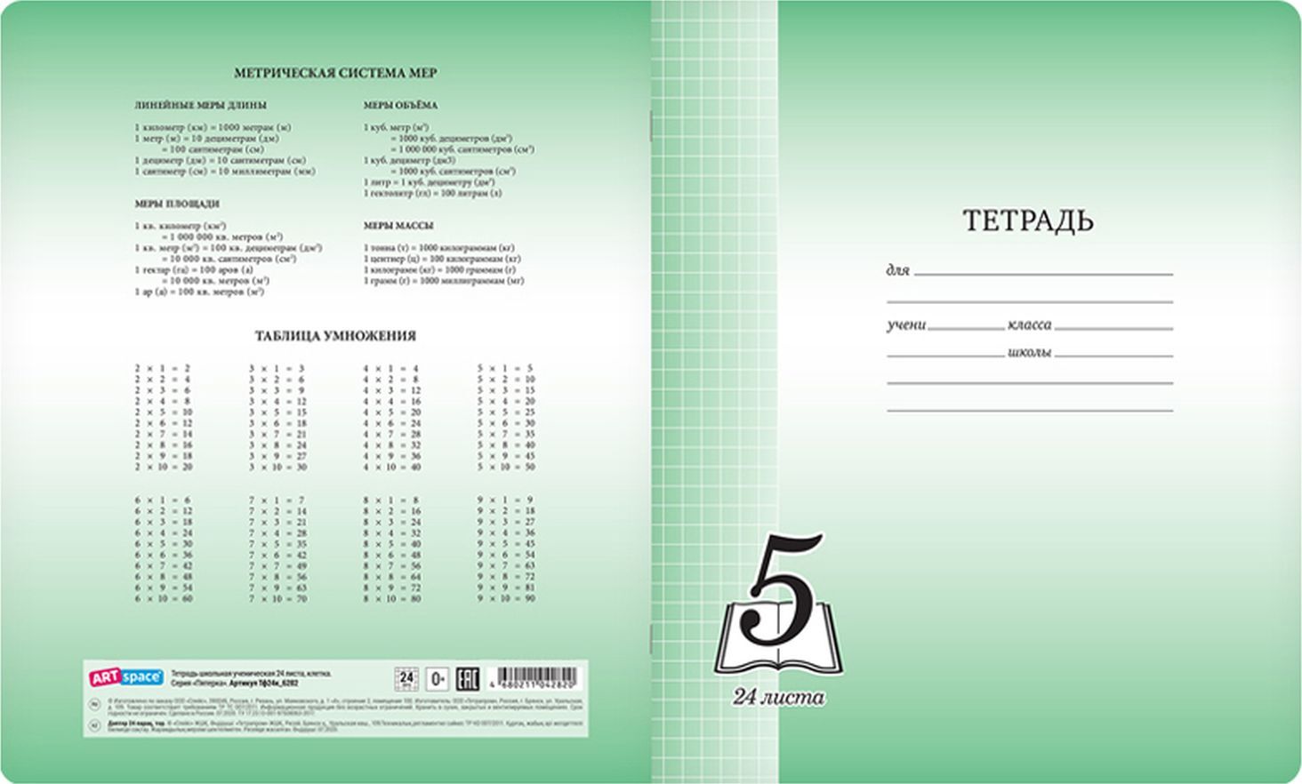 Школьная тетрадь формата А5 (165*205мм) на скрепке состоит из 24 листов. Внутренний блок – это офсетная бумага плотностью 60 г/м², белизна 100%, линовка –клетка с полями. Классическая зеленая обложка тетради ArtSpace изготовлена из офсетной бумаги. Скругл