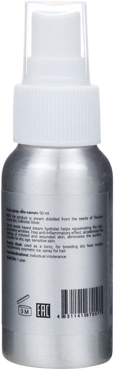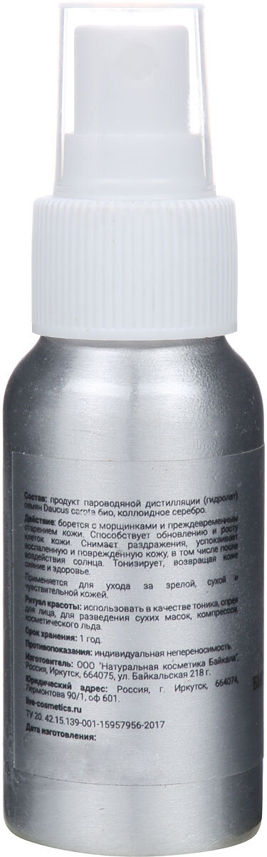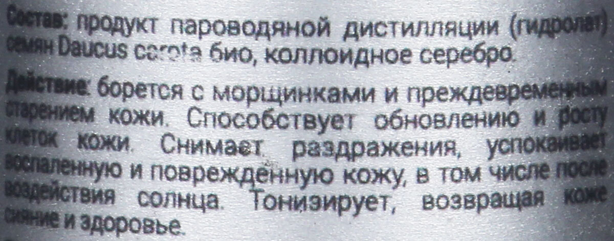 Способ применения:использовать в качестве тоника, спрея для лица, для разведения сухих масок, компрессов, косметического льда.Состав:Carrot Seed Hydrosol (продукт пароводяной дистилляции семян Daucus carota с биодинамической фермы), Colloidal Silver (колл