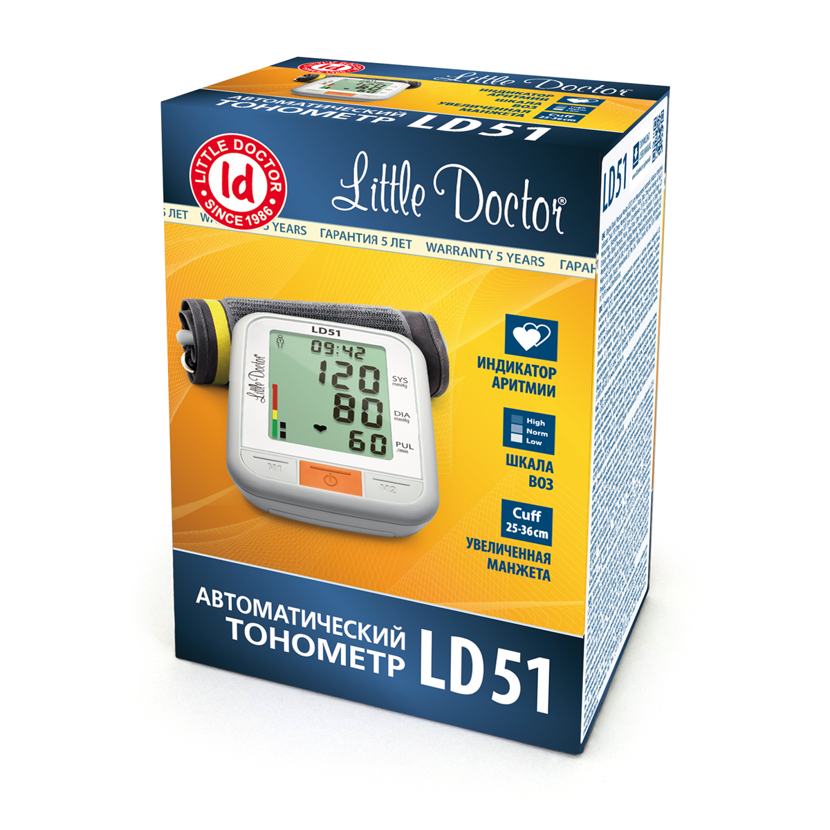 Комплектация:Электронный блок тонометра Little Doctor LD51A.Манжета Little Doctor Cuff-LDA увеличенного размера для пациентов с длиной окружности плеча 25-36 см.Сетевой адаптер Little Doctor LD-N057.Руководство по эксплуатации.Сумка для хранения прибора.К