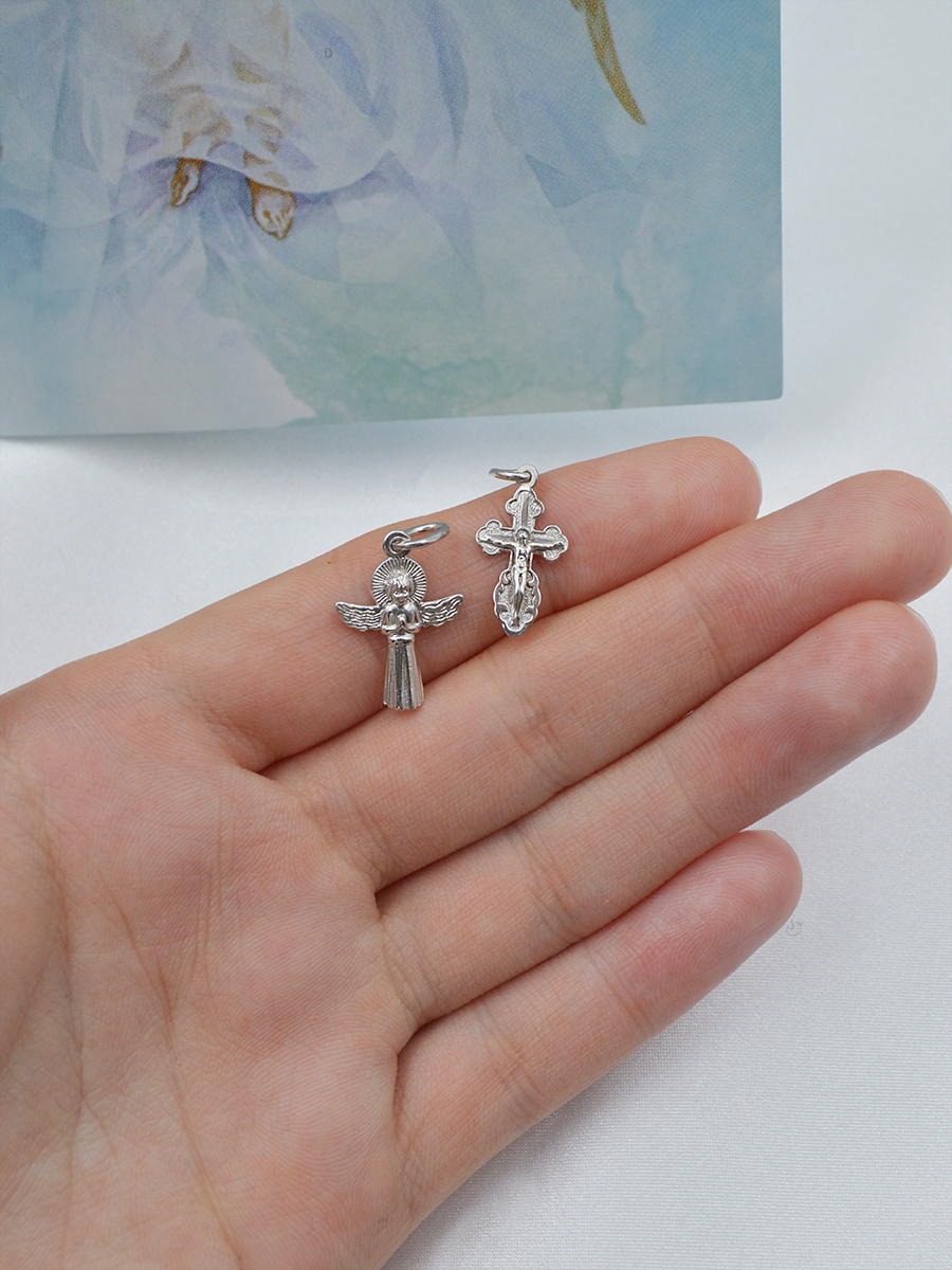 Комплектация:Крестильный набор (крестик, подвеска, шнурок, иконка, молитва).Описание:Крестильный набор для малыша включает в себя: серебряный крестик, серебряную подвеску в виде Ангела-Хранителя, шнурок, иконку и молитву. Все это упаковано в красивую упак