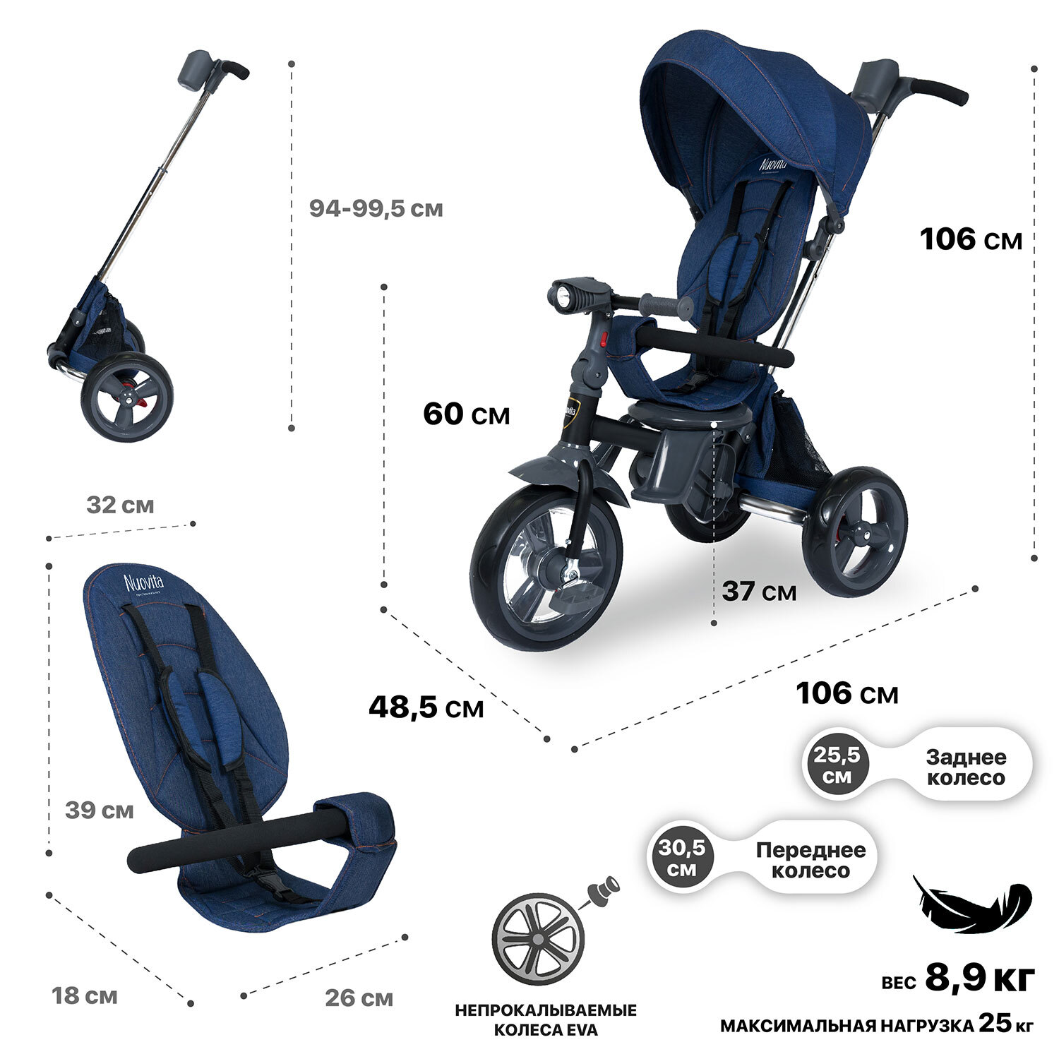 Особенности детского транспортаПодстаканник, Корзина для вещей и покупок, Козырек от солнца, Подставка для ножек, Бампер, Поворотный механизм, Ремни безопасности, Родительская ручка, Музыкальное сопровождение