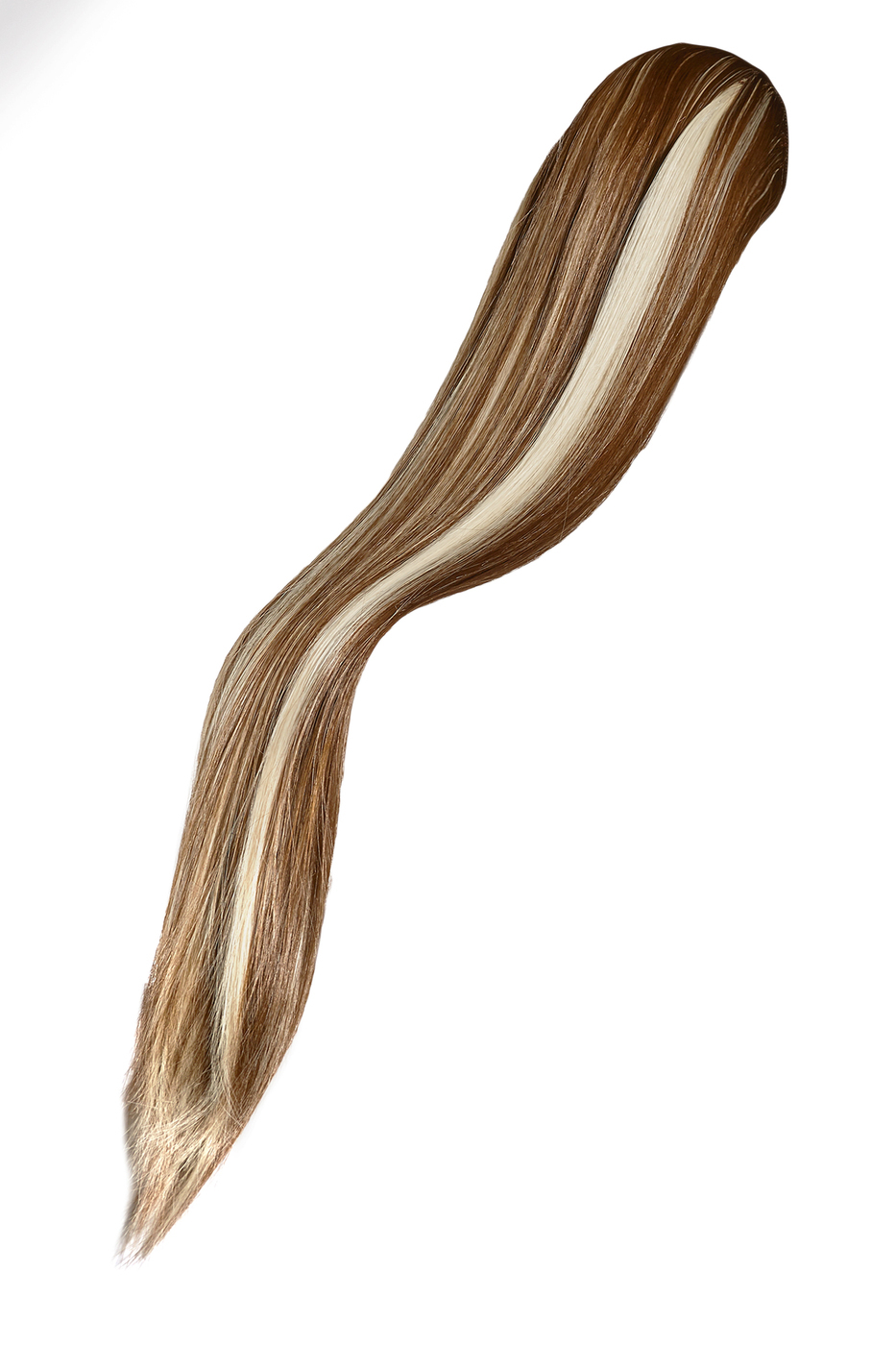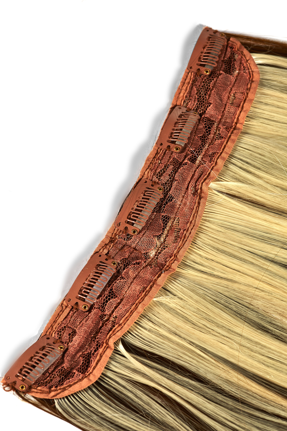 Тресс для моделирования прически. Состоит из искусственных волос, которые прикреплены к кружевной основе с пятью зажимами. Каждый зажим имеет по 6 зубцов, что обеспечивает надежную фиксацию тресса. Пряди прямые, гладкие и шелковистые, мягкие на ощупь. Тре