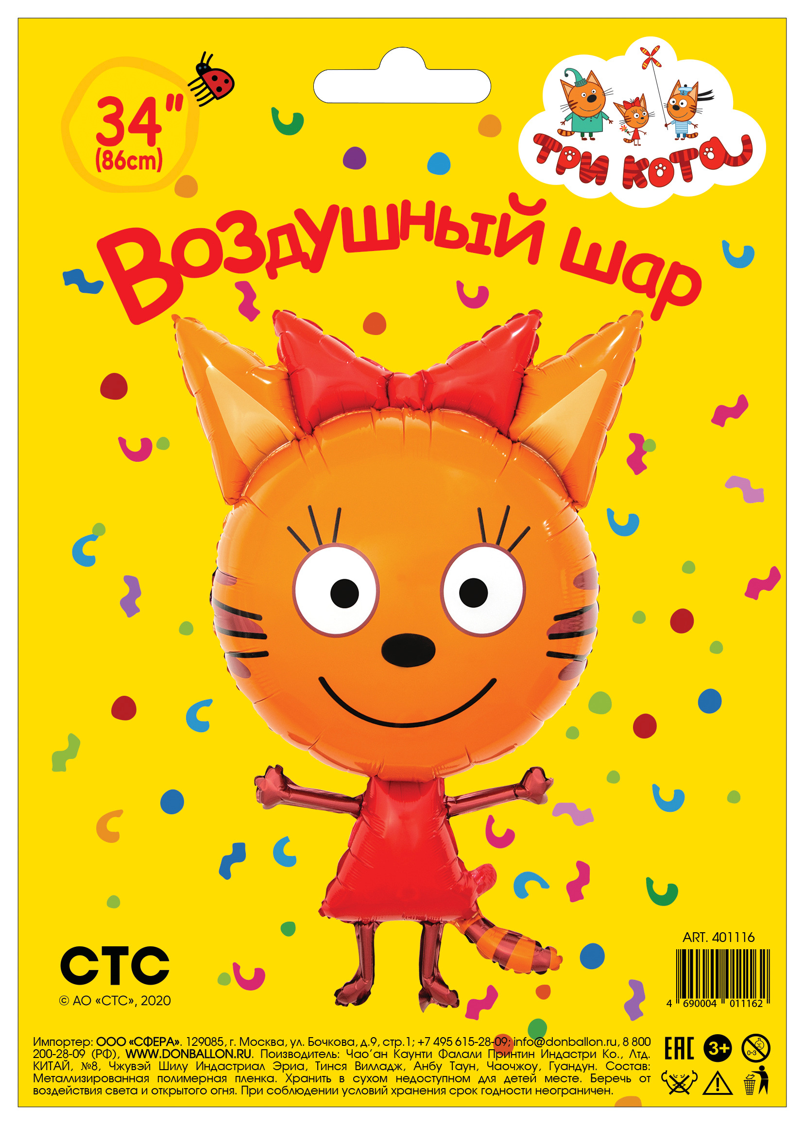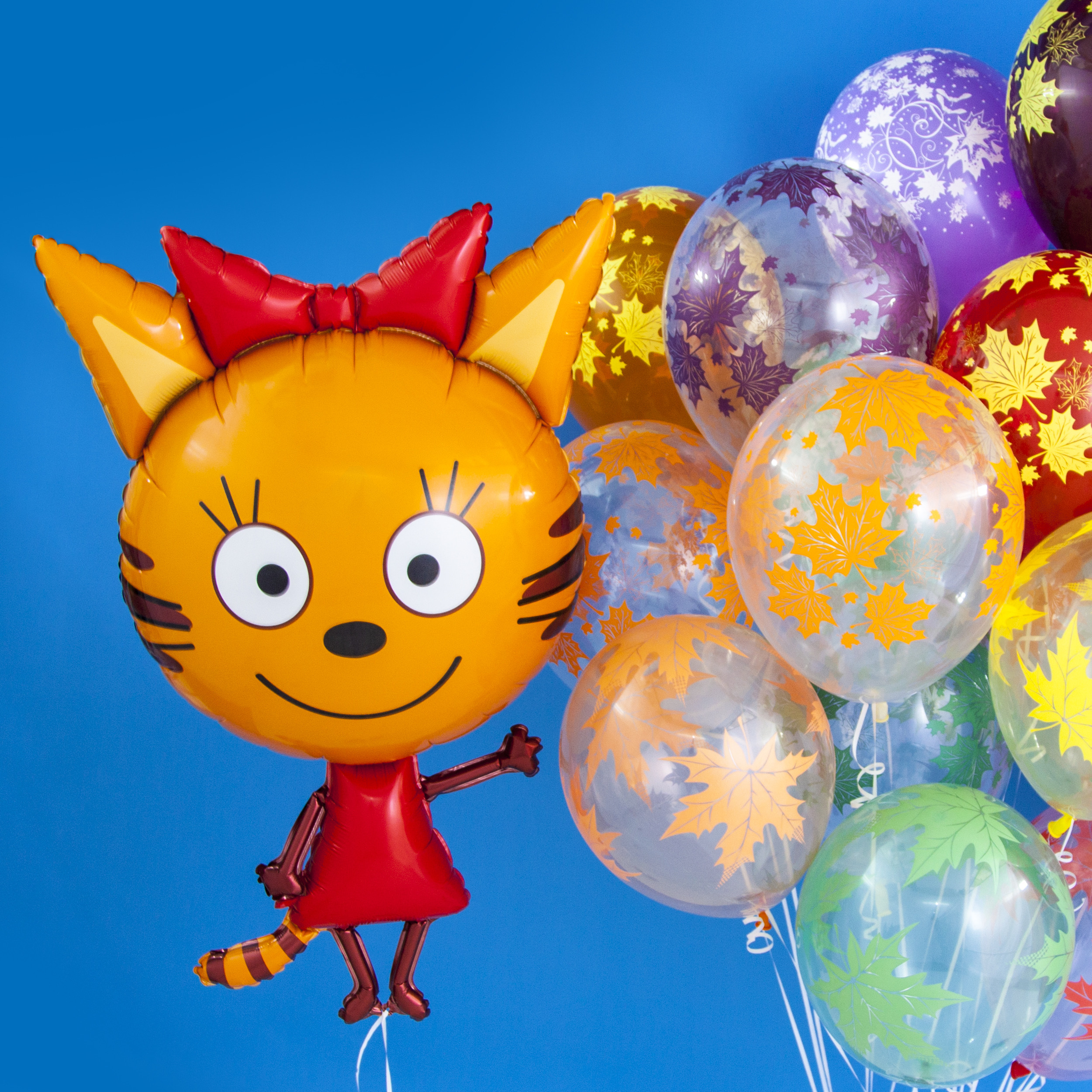 Фольгированный воздушный шар в виде фигуры Три Кота. Имеет встроенный клапан. Приспособлен под гелий, а так же под воздух. Фольгированные воздушные шары изготавливаются из тонкой миларовой пленки, позволяющей шару не сдуваться в течение нескольких дней. Ф