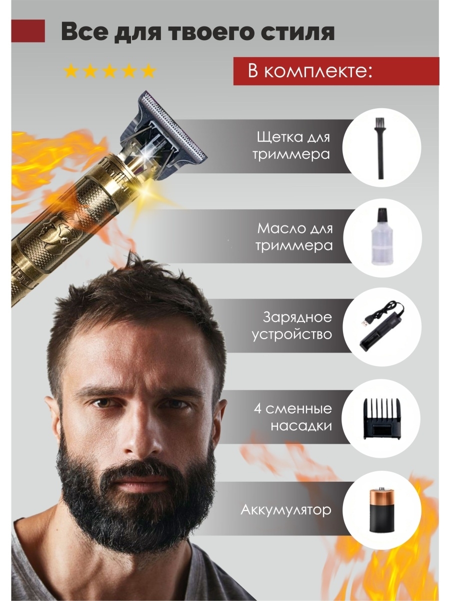 Профессиональный, многофункциональный, электрический, аккумуляторный триммер Дракон для бритья волос, для бороды, для усов - подходит как для мужского салона барбершопа так и для домашнего использования. Триммер с насадками в комплекте 4 шт: 1,5 мм., 2 мм