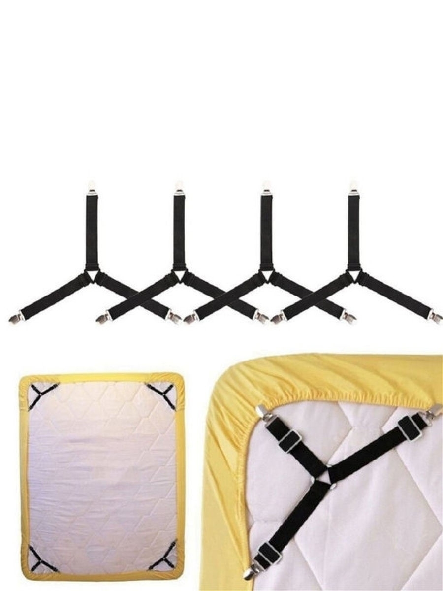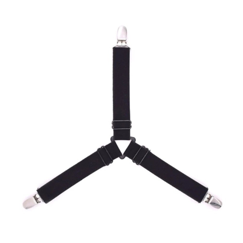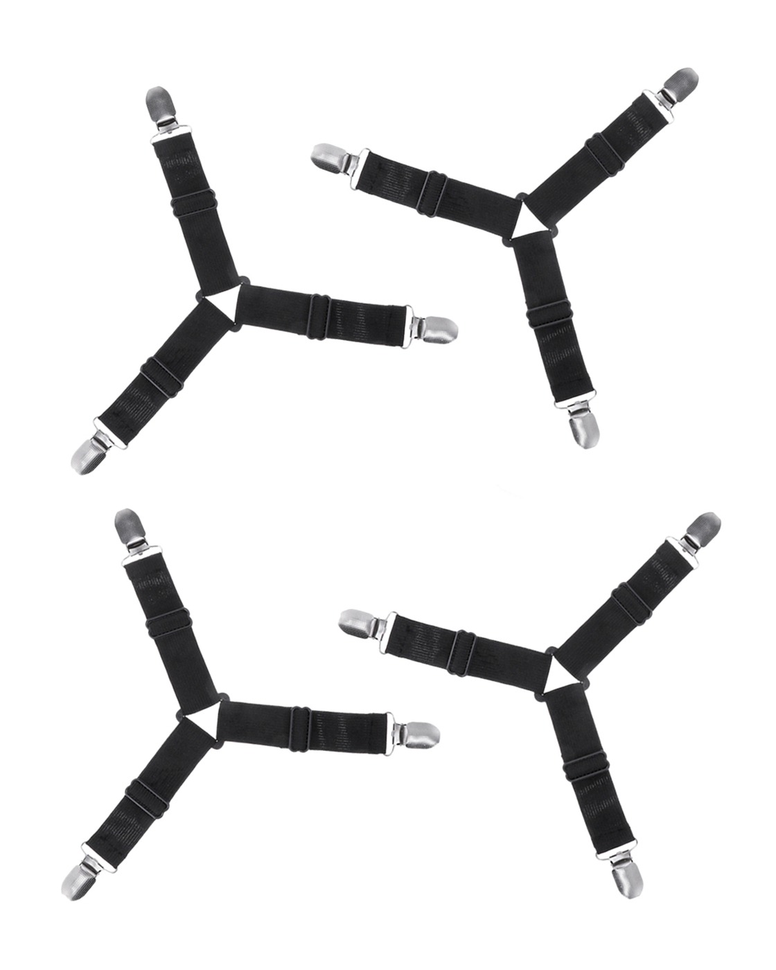 Держатели для простыни изготовлены из эластичного полиэстера и качественного металла. В комплект входят 4 фиксатора, цвет - белый и черный. Зажимы предназначены для надежной фиксации простыни, пледа, одеяла либо покрывала с четырех сторон на диване или кр