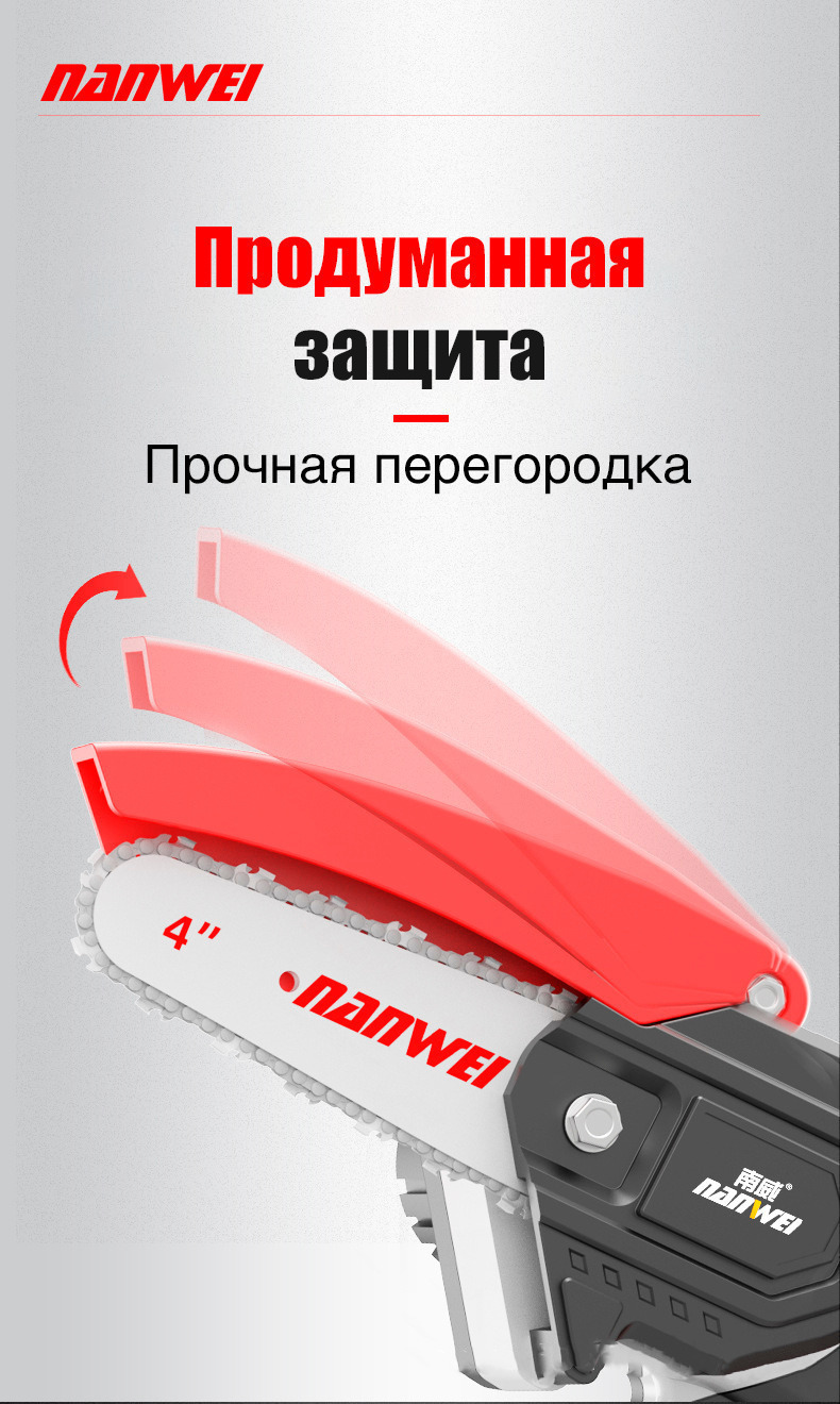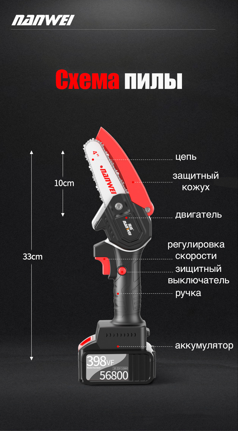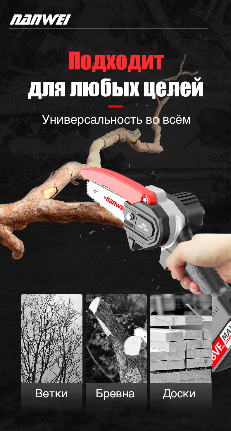 Комплектация:Цепная пила - 1шт; Зарядное устройство - 1 шт; Аккумуляторы - 2 шт; Перчатки; Ключ и отвертка для регулировки цепи - 1 шт;