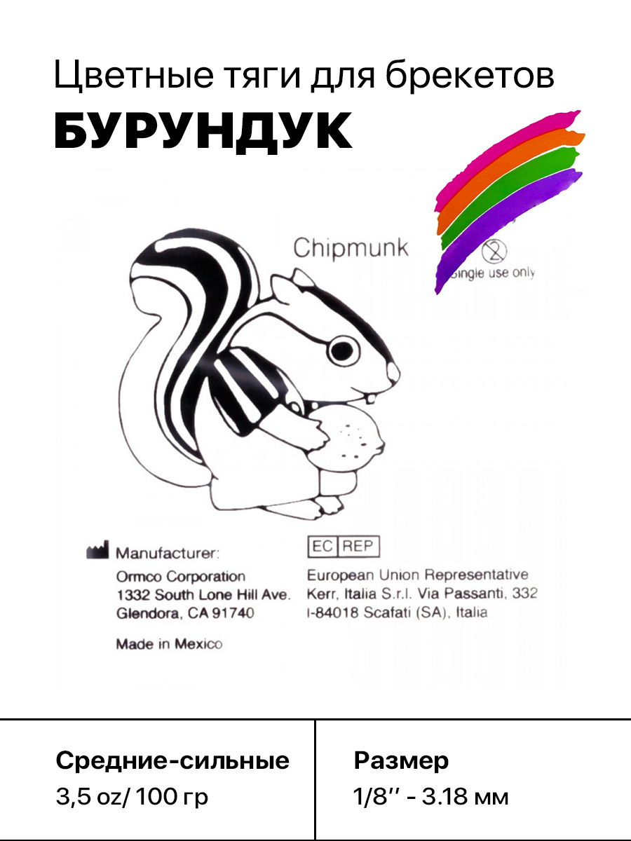 Ортодонтические кольца Ormco Chipmunk длиной 3,18 мм служат для выпрямления зубов и коррекции прикуса. При растяжении эластиков в 3 раза сила натяжения равняется 100 г. Резиновая тяга для брекетов "Бурундук" относится к серии изделий "Зоопарк" и группе ко
