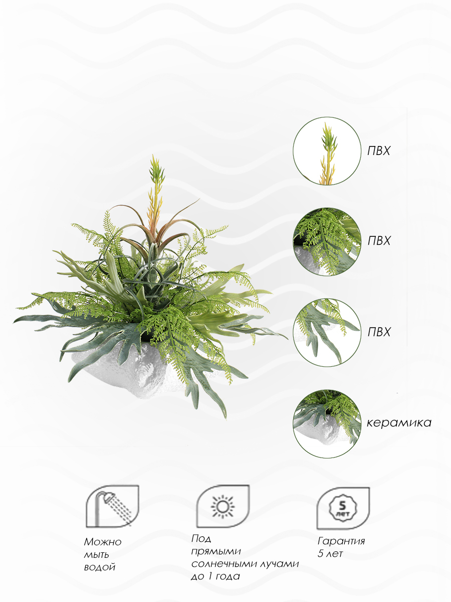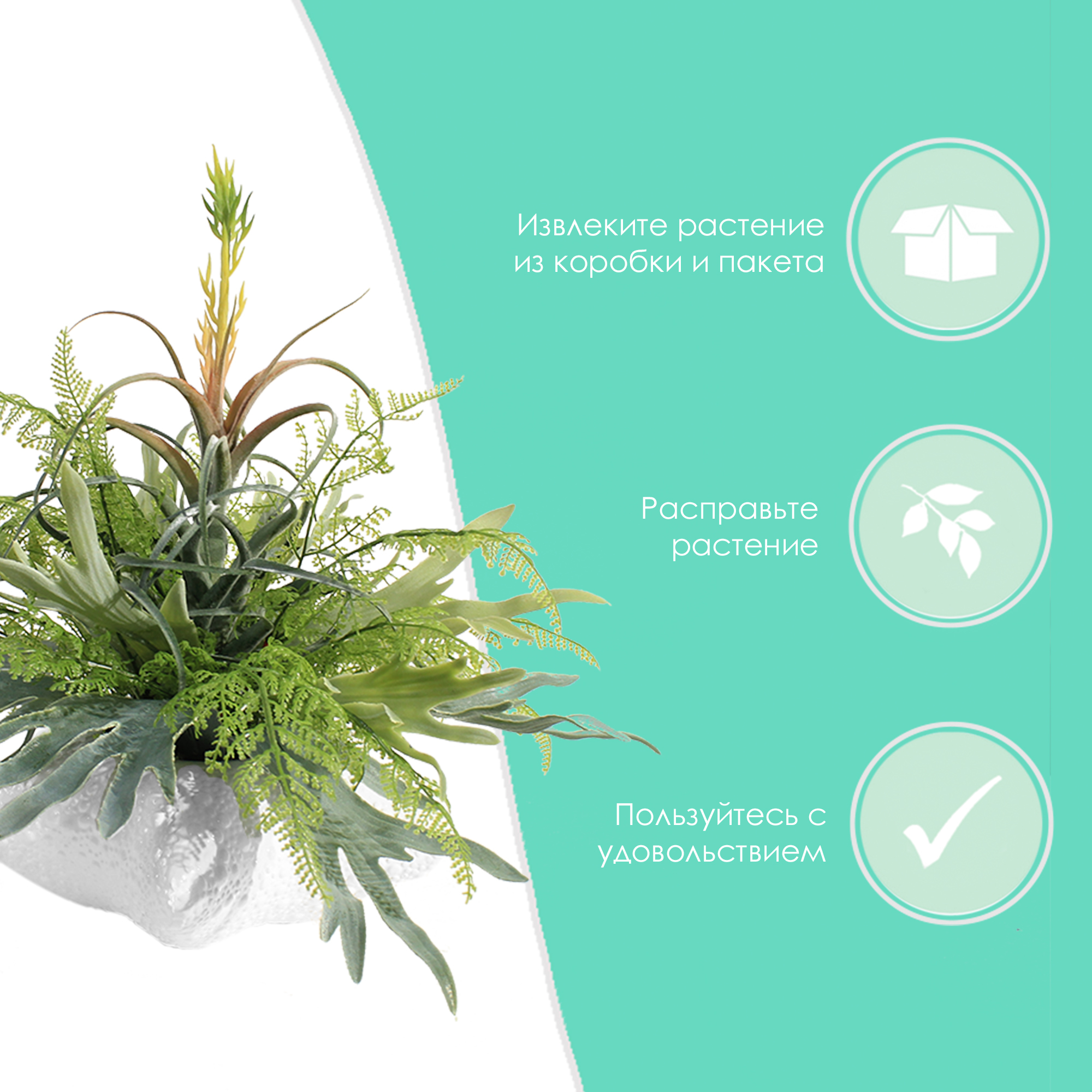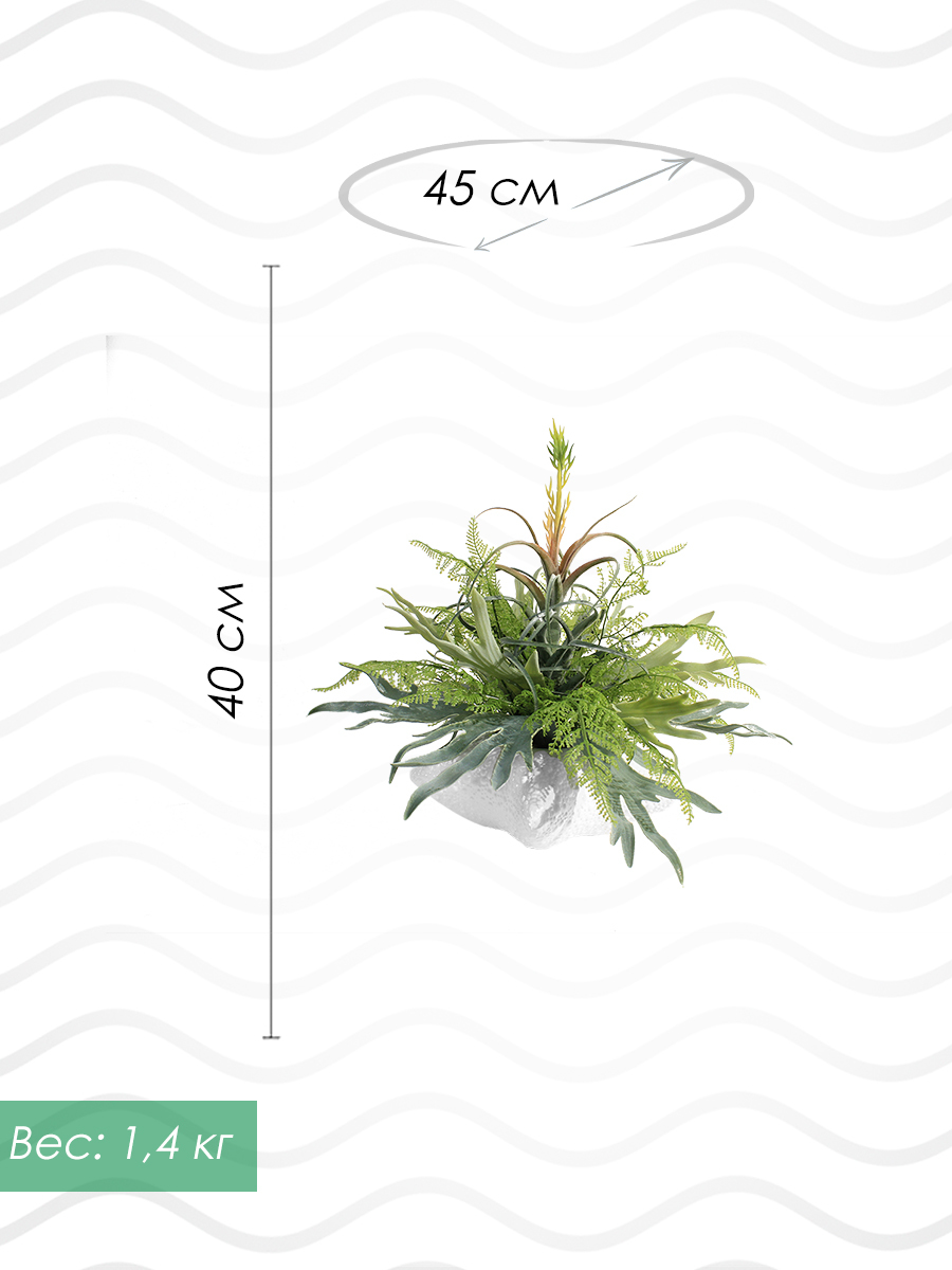 Комплектация:цветок декоративный, камни для декора, кашпо, упаковкаОписание:Искусственная композиция Тилландсия цветущая в кашпо Звезда. Великолепный искусственная тилландсия - это экзотическая красавица с сочно-зелеными листьями. Растение непременно стан