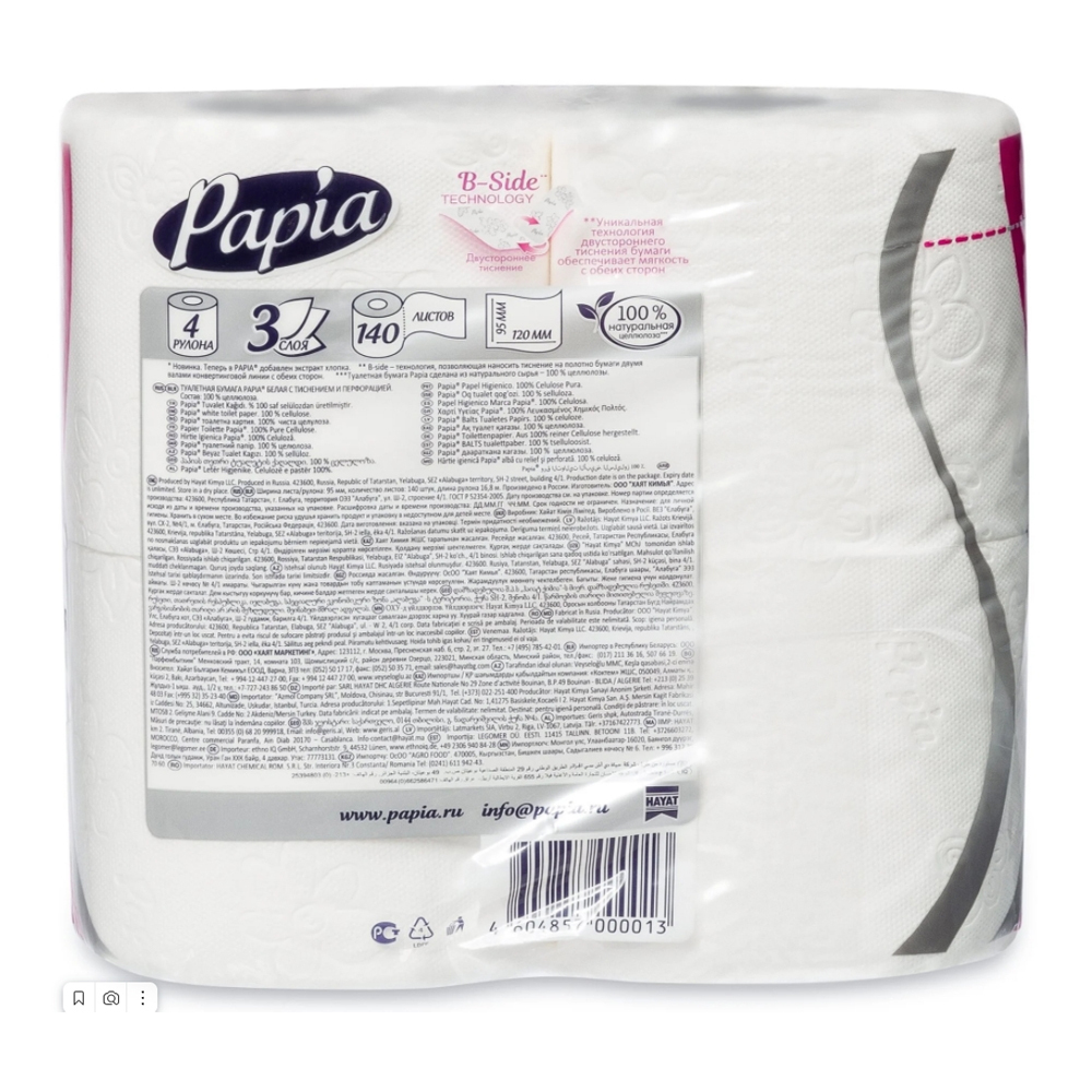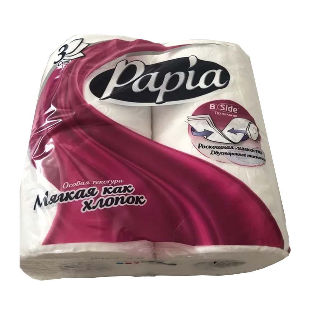 Туалетная бумага Papia имеет 3 слоя, что даёт невероятную мягкость использования. Она создана из экологически натурального материала, целлюлозы вторичной переработки, потому не вызывает раздражений или аллергии. Такая бумага для туалета не имеет в составе