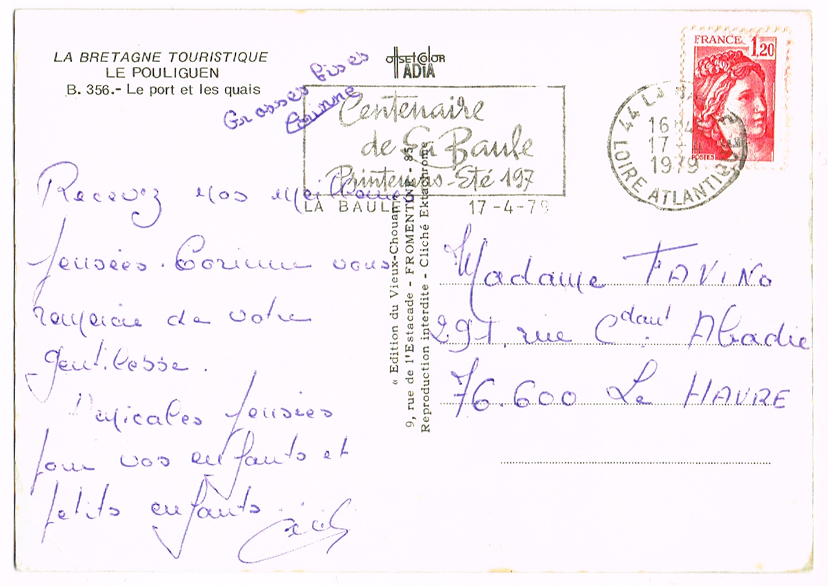 Туристическая Бретань. Ле Пулиген. Порт и доки (La Bretagne touristique. Le Pouliguen. Le port et les quais). Почтовая карточка (открытка). Франция, 1979 год. Размер 14,7 х 10,4 см. Сохранность очень хорошая. Письмо, два штемпеля, марка.