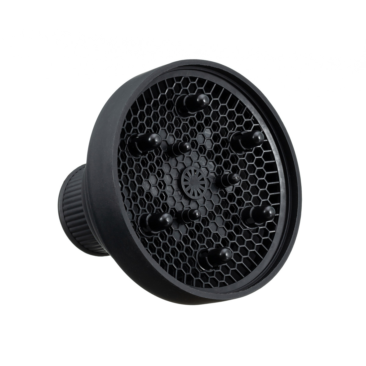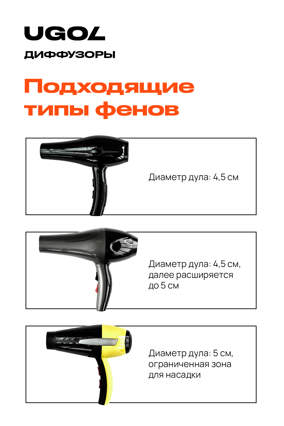 Размеры:Высота в сложенном виде — 6 смВысота — 12 смШирина — 13,7 смДиаметр входного отверстия — 5 смОсобенности:Помогает уложить волнистые и кудрявые волосы, не травмируя их. Фиксирует волосы за счет пальчиков и помогает формировать локон во время укладк
