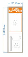 Уголок потребителя - размер 250х750 мм., карманы формат А4, тонкий - 1 шт. формат А5, объемный 1 шт (Белый фон, оранжевые элементы - Рамка "серебро" алюминиевая)