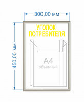 Уголок потребителя - размер 300х450 мм., карманы формат А4, объемный 1 шт (Белый фон, желтые надписи - Рамка "серебро" алюминиевая)