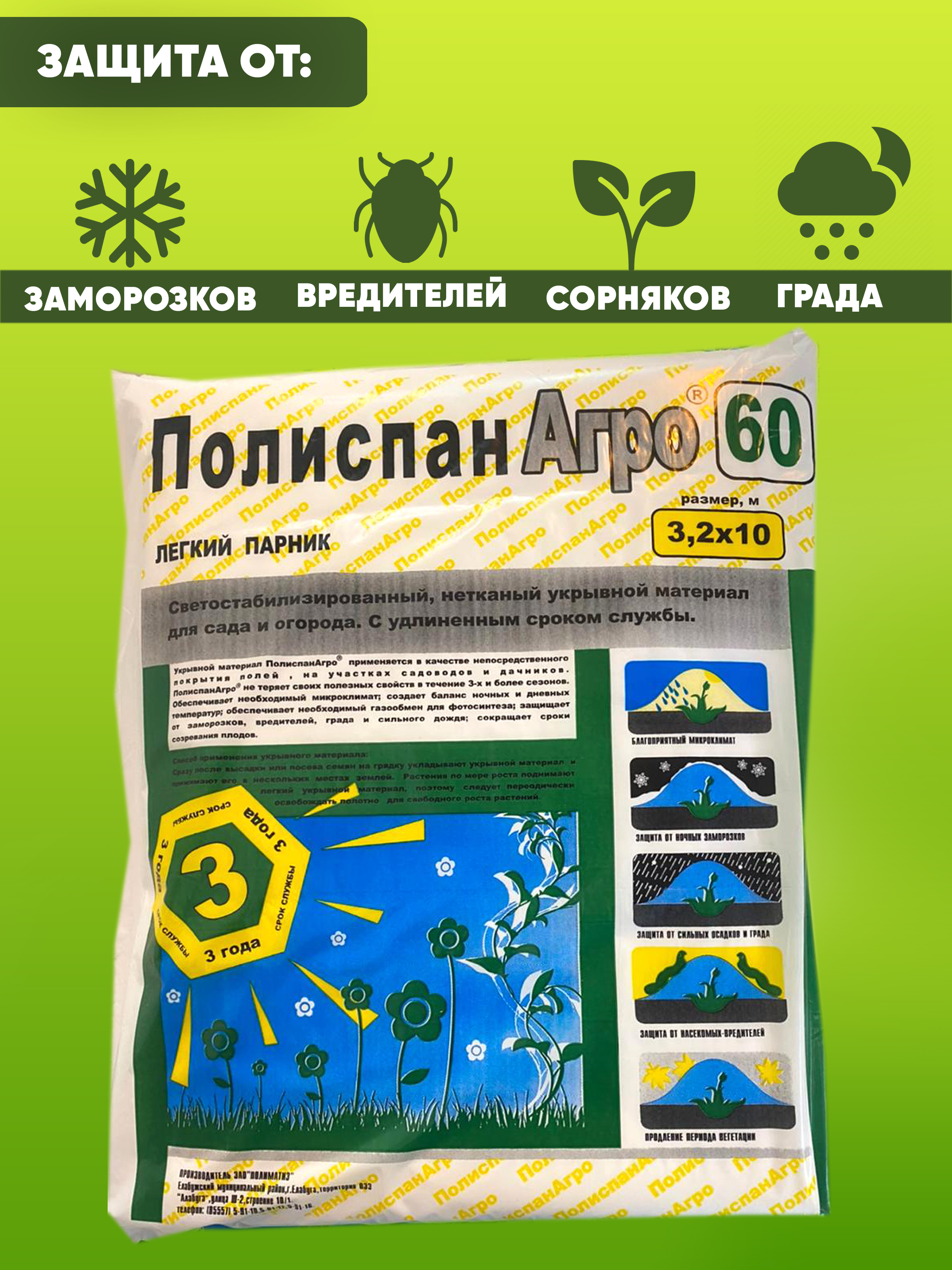 Укрывной материал Полиспан®Агро - плотный, прочный, имеет в составе ультрафиолетовые стабилизаторы, предохраняющие материал от разрушающего воздействия солнечного светаЧестная плотность 60 г/м2 ! вес 1850-1900 гВсе это позволяет нам гарантировать срок с
