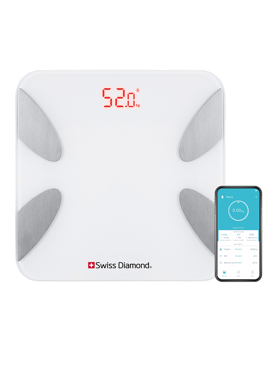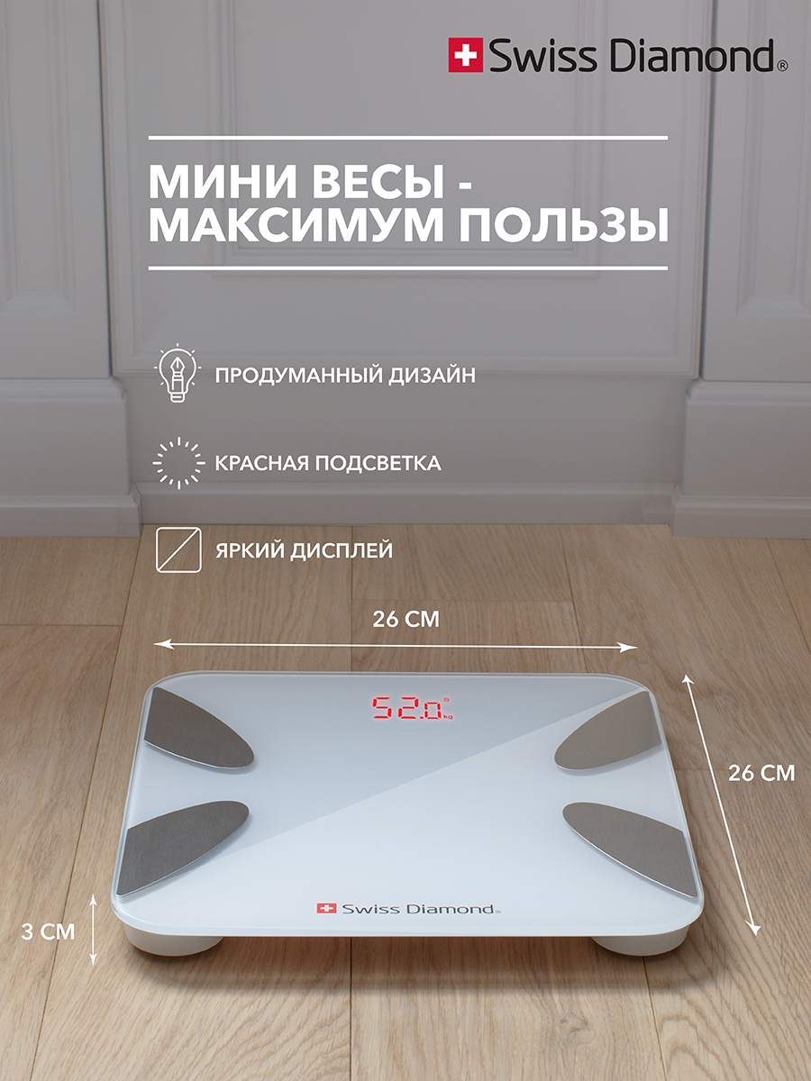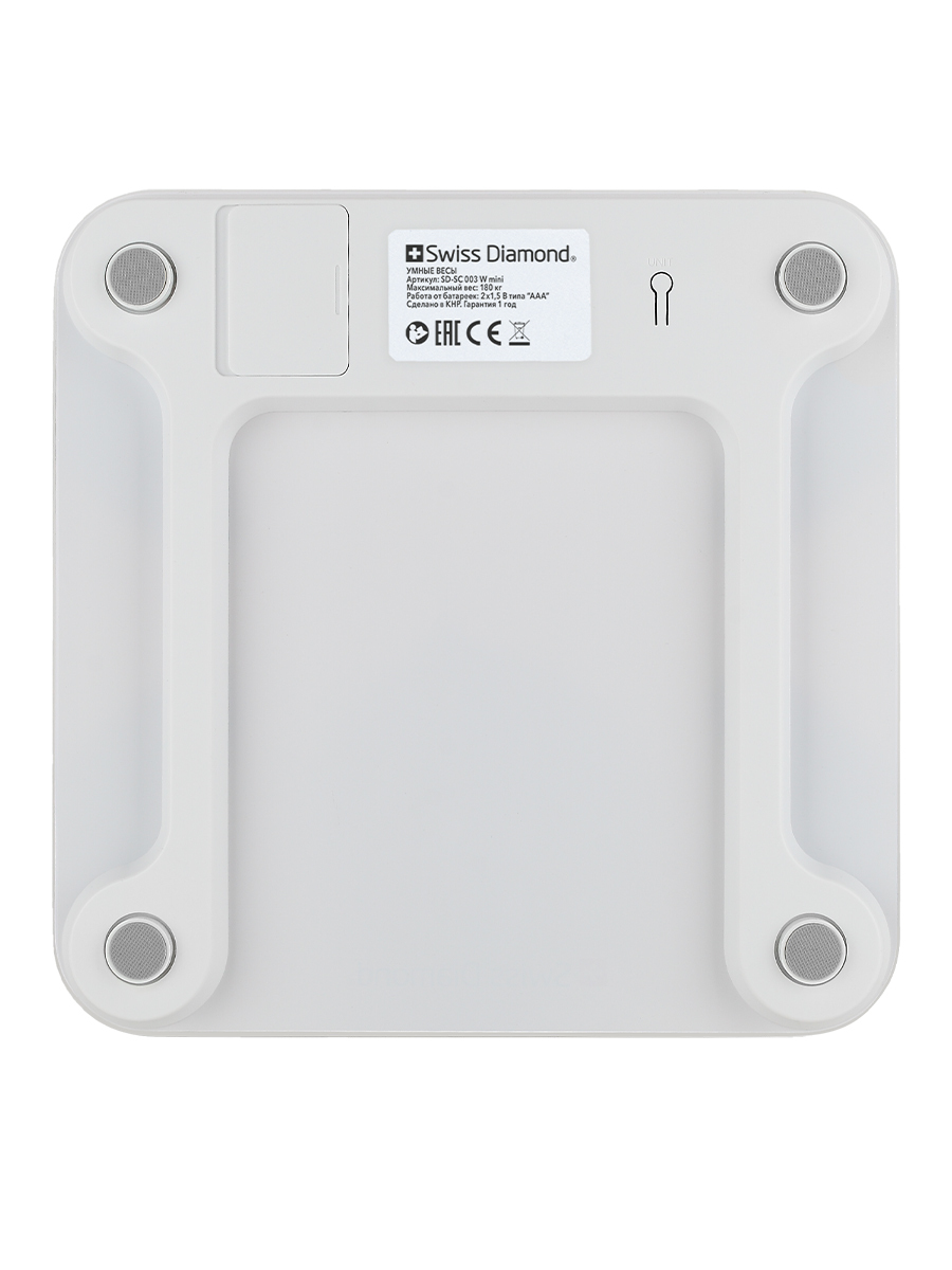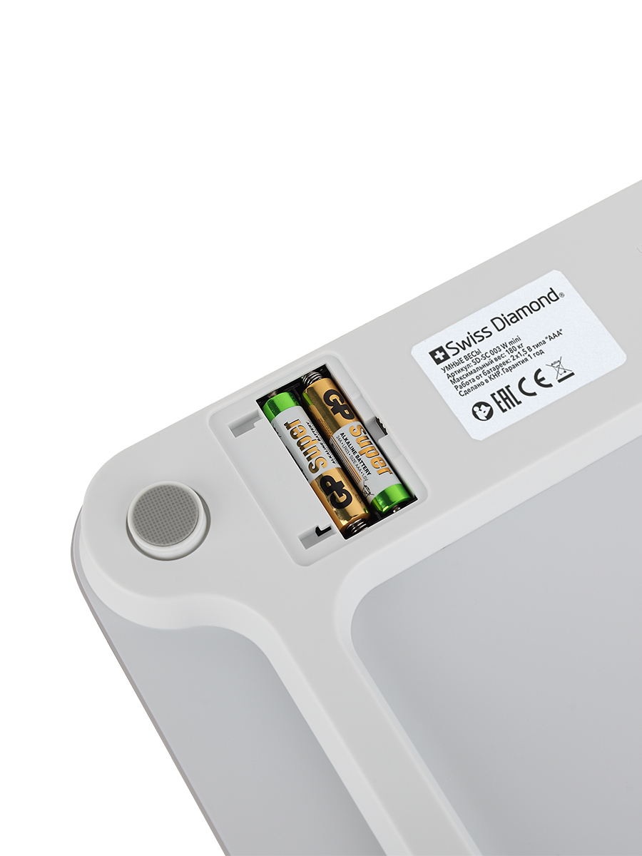ФункцииИндикатор разряженной батарейки, Автоматическое выключение, Индикатор перегрузки, Автоматическое включение, Определение доли мышечной массы, Определение доли воды, Определение доли жира, Определение доли костной ткани, Расчет индекса массы тела, Светящиеся символы дисплея, Ввод индивидуальных данных, Измерение динамики веса, Память предыдущего взвешивания