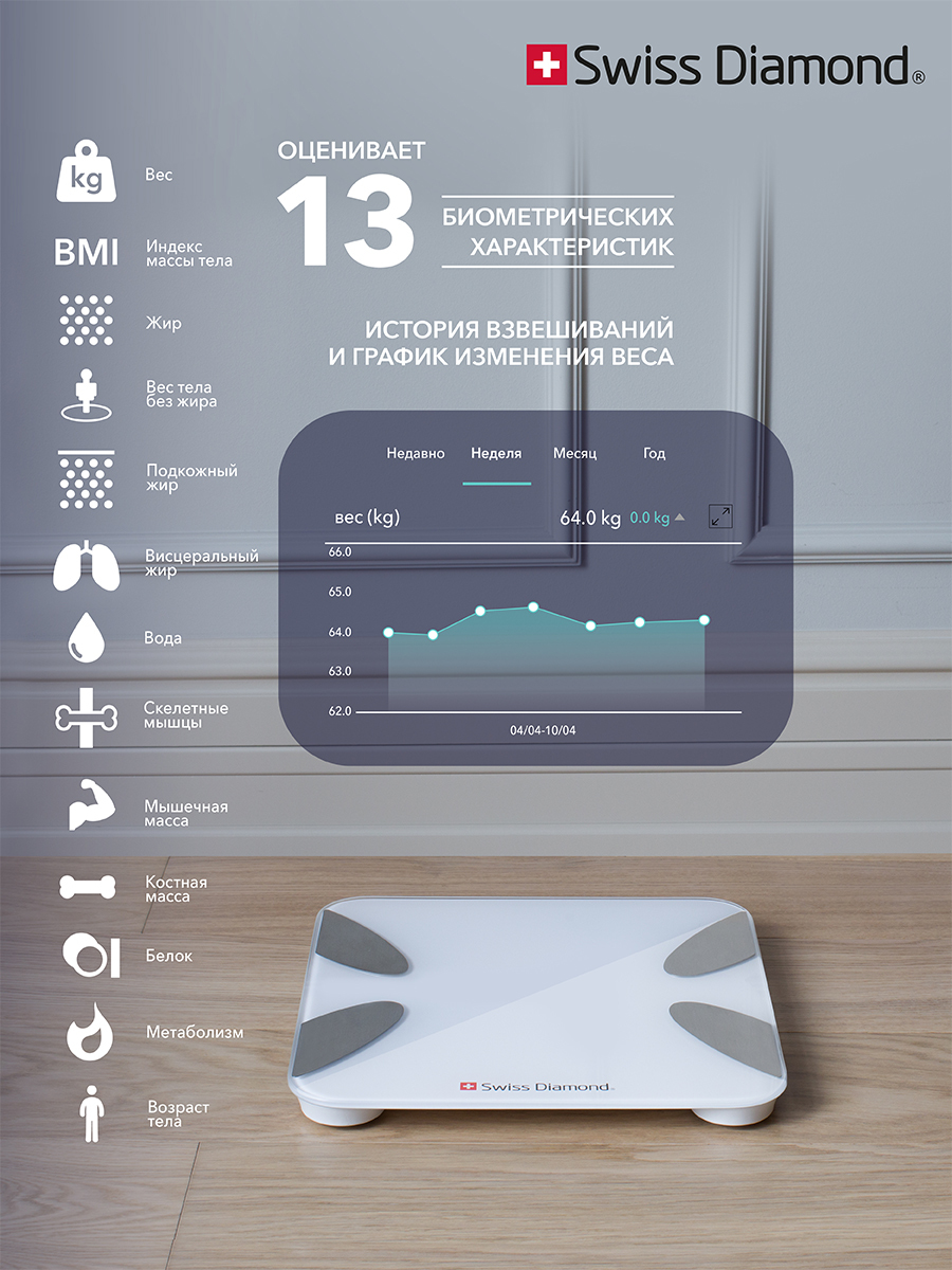 ИзмеренияВес, Жировая масса, Мышечная масса, Костная масса, Индекс массы тела, Содержание воды, Метаболизм, Висцеральный жир, Биологический возраст, Измерение белка, Скелетные мышцы