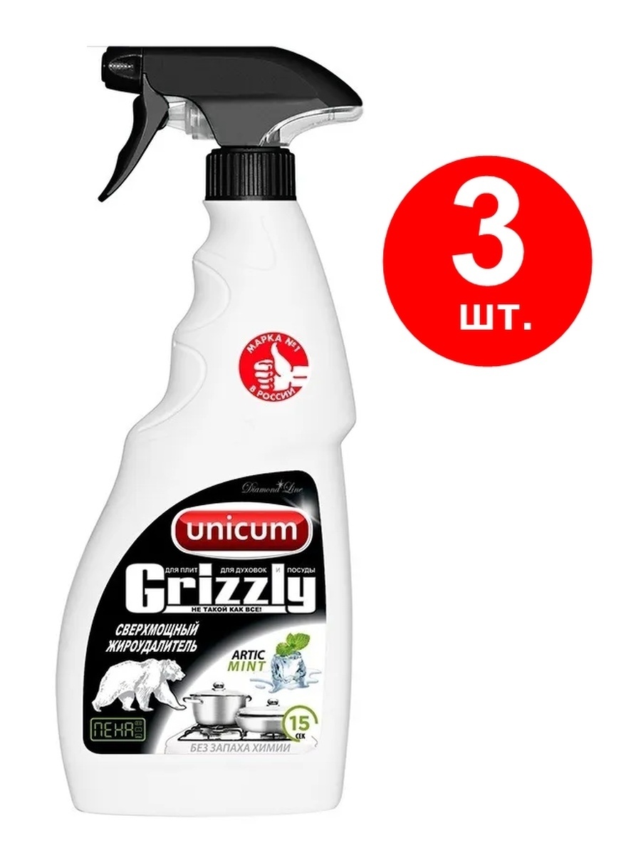 В наборе 3 штуки по 500 мл! Сверхмощный жироудалитель UNICUM Гризли. Первый удалитель жира с активной формулой подавления запахов! Аромат мяты вместо запаха химии! Чистящее средство для мгновенного удаления самых стойких застарелых и подгоревших масложиро