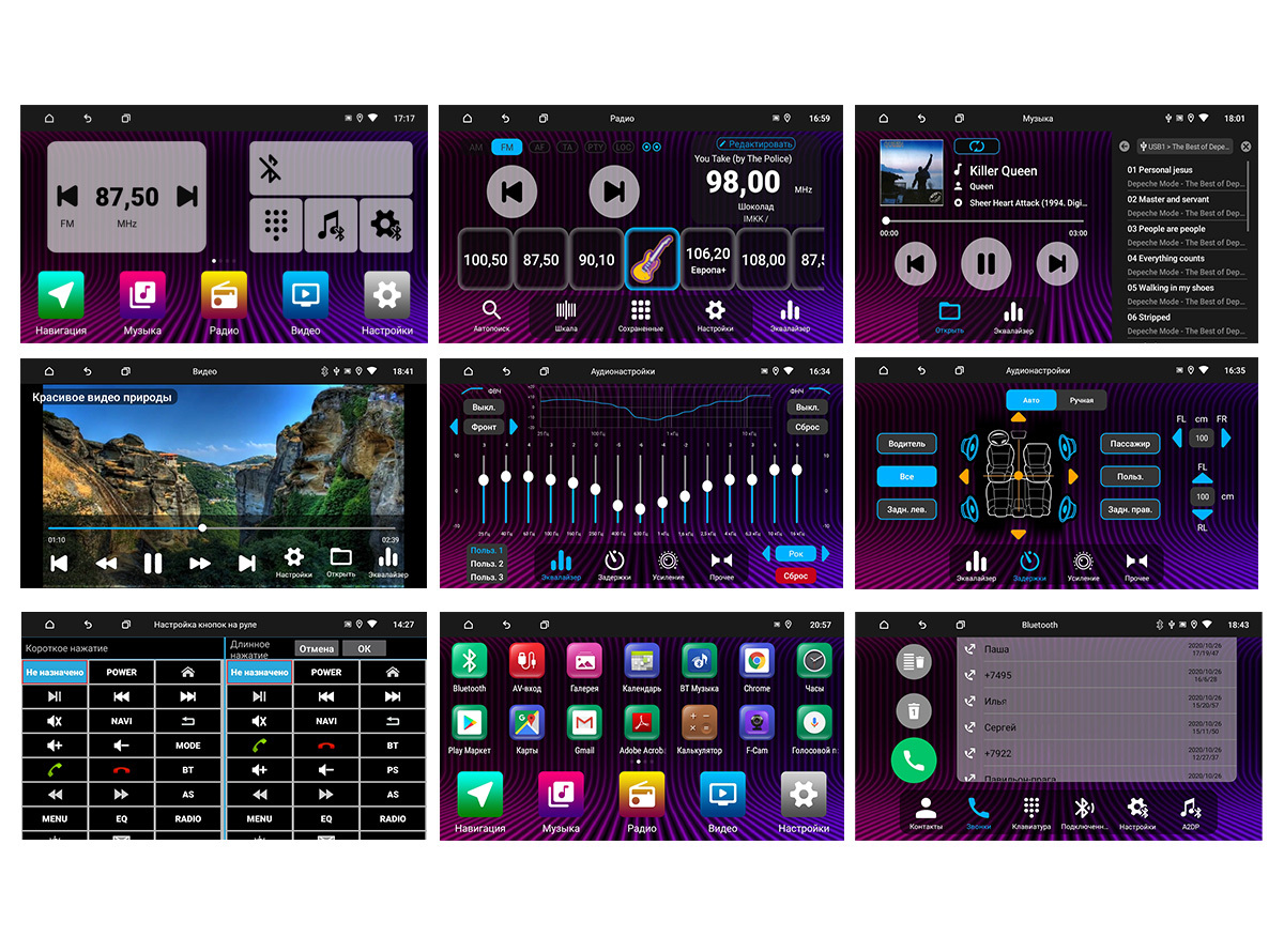 Операционная система Android 10 9" емкостный QLED TFT LCD дисплей Разрешение экрана 1280 × 720 px Стекло 2.5D 8-ядерный процессор RockChip PX5 A53 1,5 GHz Оперативная память DDR3 4 Gb Внутренняя память 64 Gb Встроенный GPS/Glonass модуль UBlox 8 Встроенны