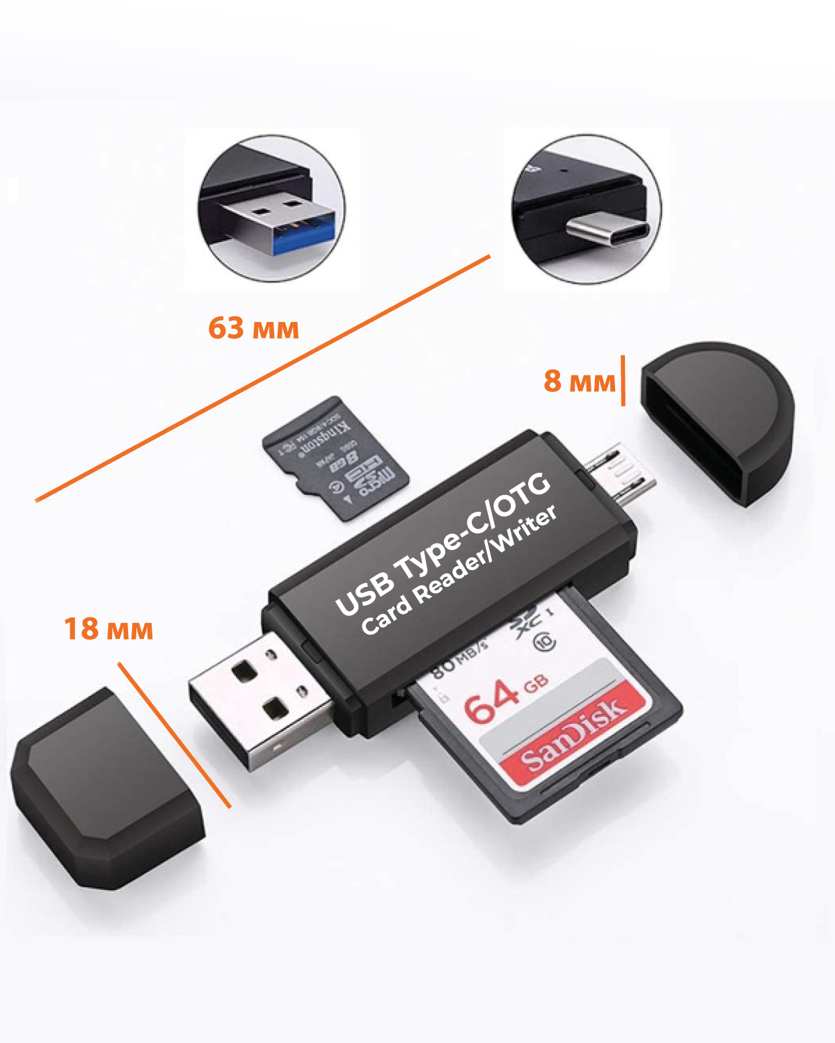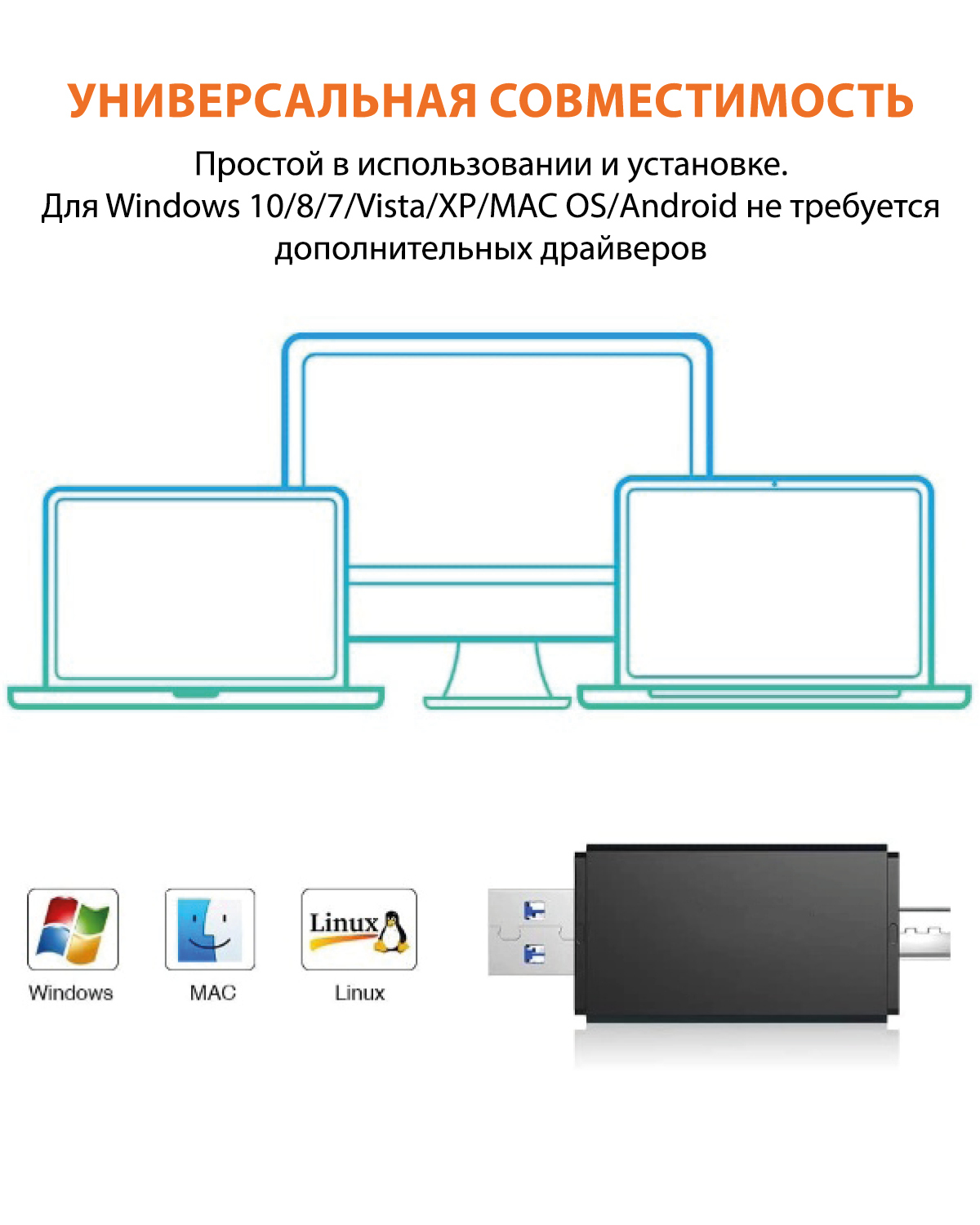 USB картридер 3 в 1 для ноутбука, компьютера и мобильных гаджетовУниверсальный USB card reader – компактное устройство со слотами для чтения карт памяти. С его помощью можно быстро переносить информацию с карточки на другой носитель (ноутбук, планшет, ком