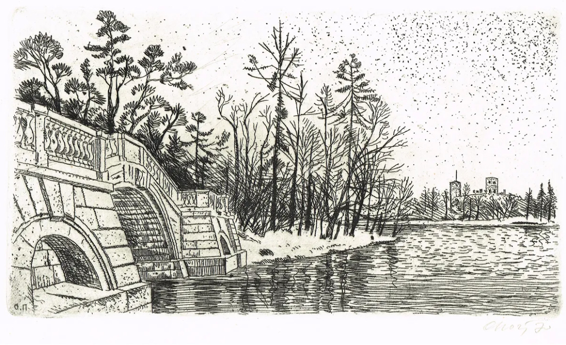 В Гатчинском парке. Офорт. СССР, 1971 год. Художник Олег Алексеевич Почтенный (1927-1997). Размер листа 40,5 х 30,5 см. Размер изображения 32,5 х 18 см. Сохранность коллекционная. В левом нижнем углу - подпись художника на доске - инициалы ОП (Олег Поч