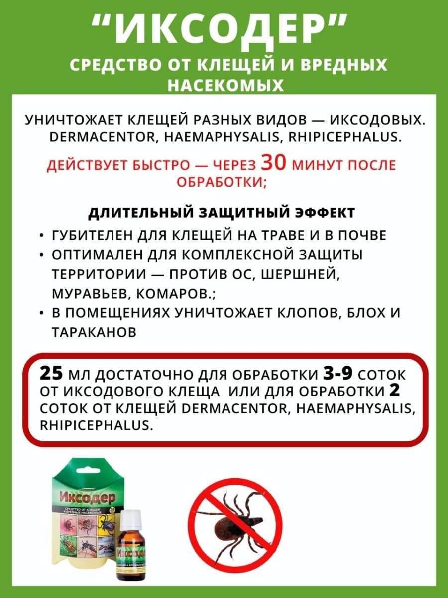 Средство для уничтожения клещей разных видов - иксодовых. Dermacentor, Haemaphysalis, Rhipicephalus. Препарат от клещей действует быстро - через 30 минут после обработки. Длительный защитный эффект - губителен для клещей на траве и в почве до 1-1,5 месяце