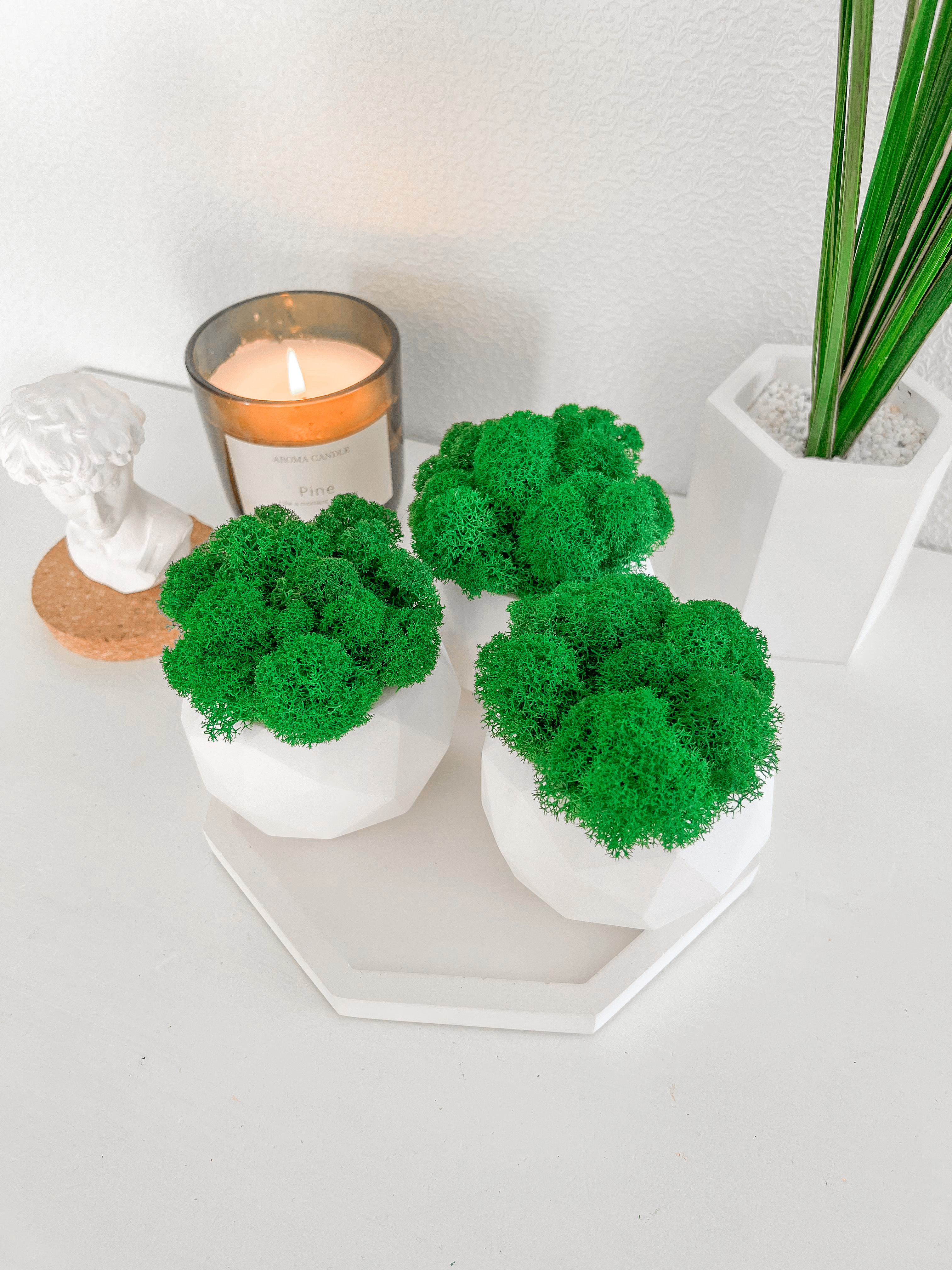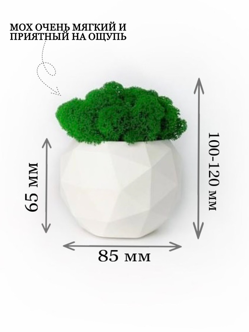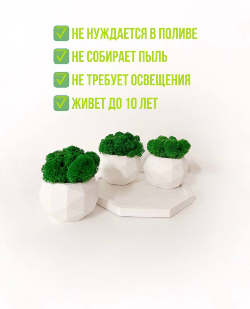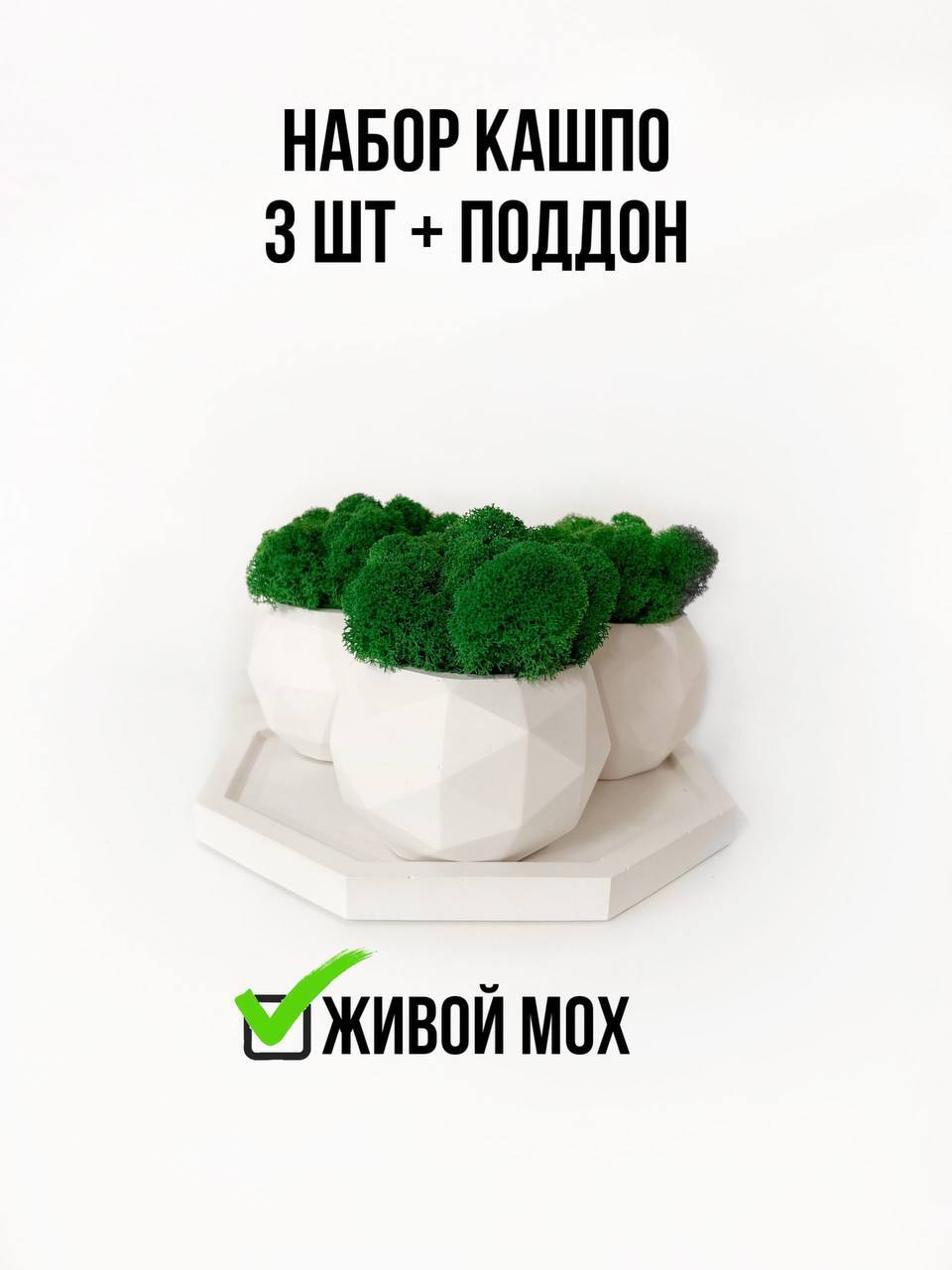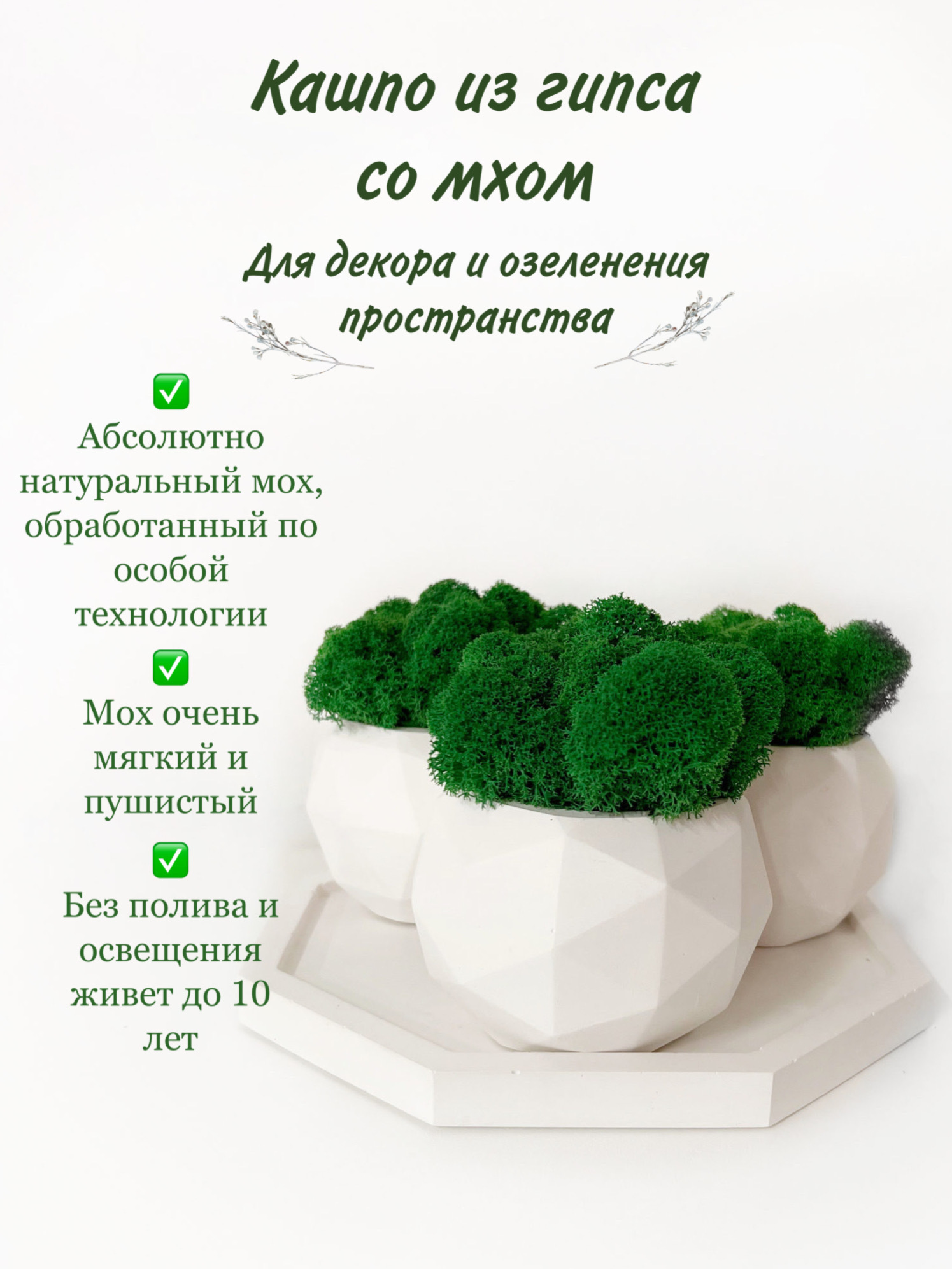 Комплектация:Кашпо шар 3 штМох стабилизированный для кашпо 3 штПоддон 1 штОписание:Давно хотели озеленить свой дом? Тогда кашпо со мхом из гипса как раз то,что Вам нужно!Стабилизированный мох-это живой мох, пропитанный составом на основе глицерина, воды и