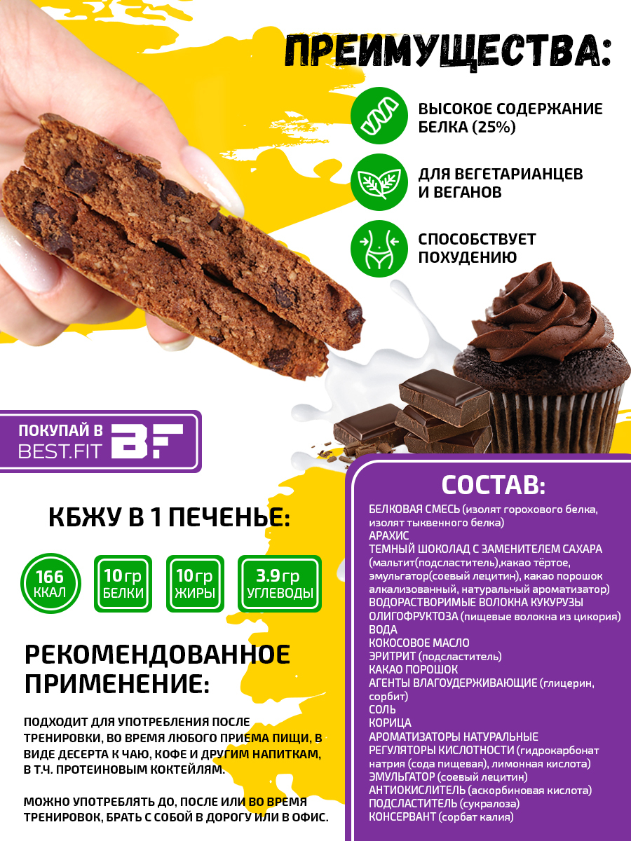 В составе веганского протеинового печенья Bombbar используются заменители молочного протеина: изолят горохового белка с добавлением растительных пищевых волокон. Этот десерт на 25% состоит из протеина, а потому дарит продолжительное и стабильное чувство с
