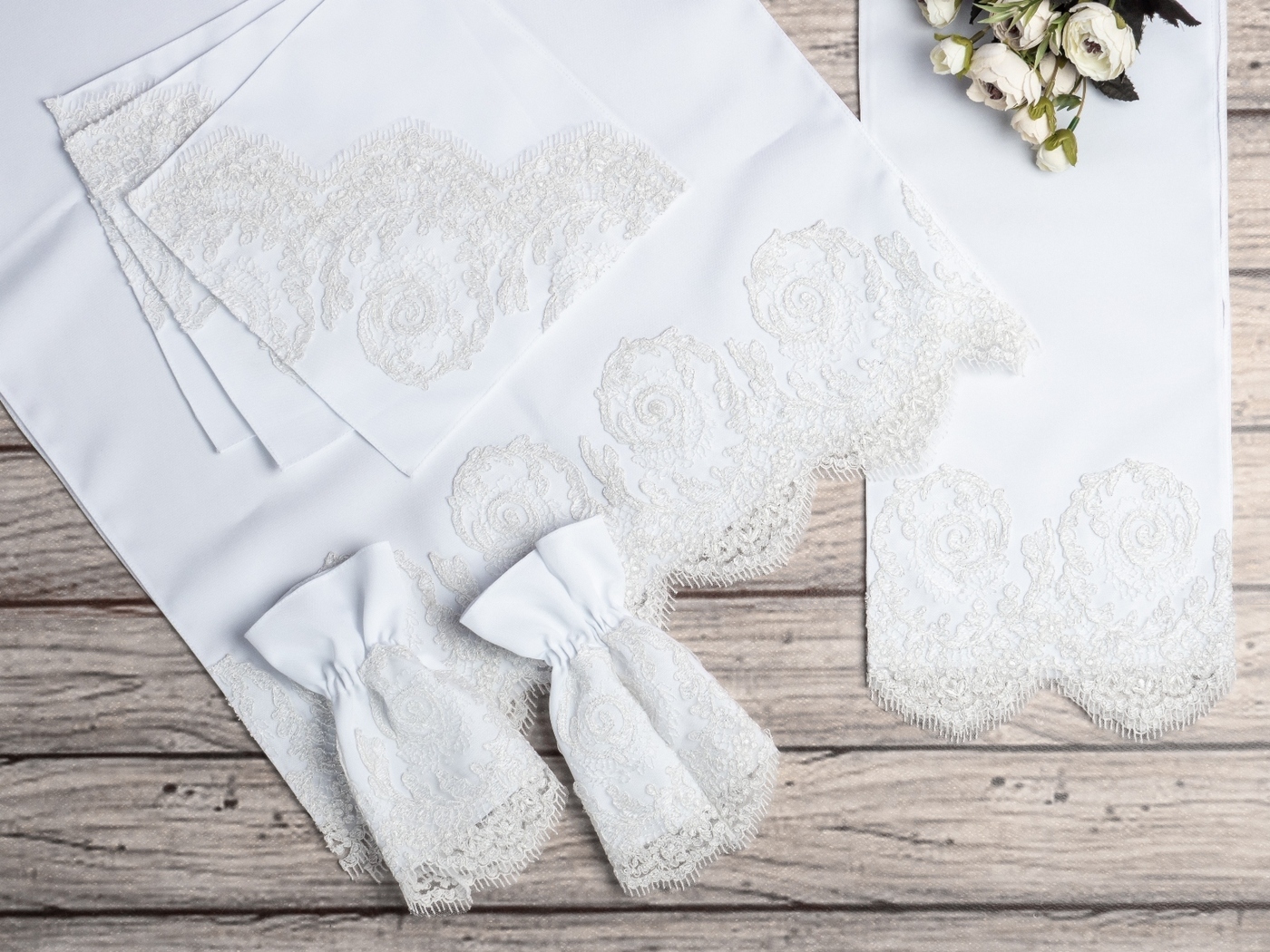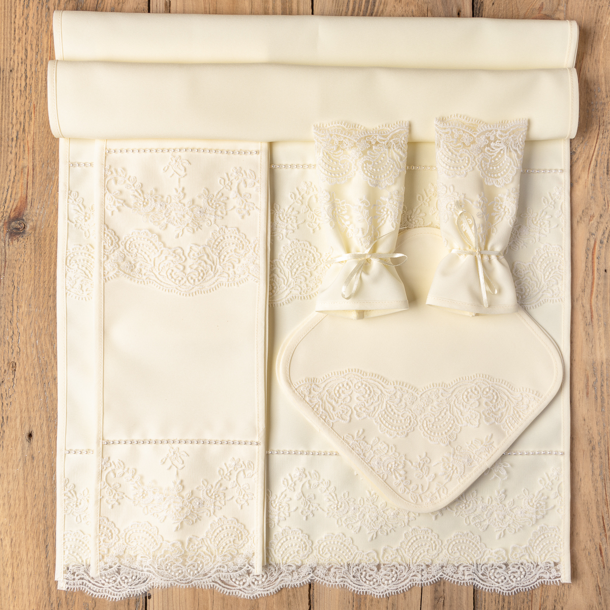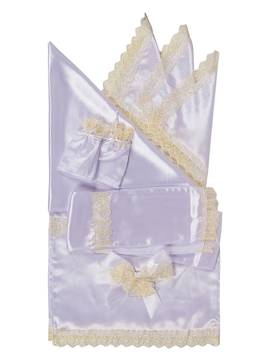 Венчальный набор "Валенсия" выполнен из плотной атласной ткани красивого цвета айвори. Все предметы набора декорированы кружевом и россыпью сверкающих страз. Набор состоит из 7 предметов: рушника, полотенца, трех салфеток и…