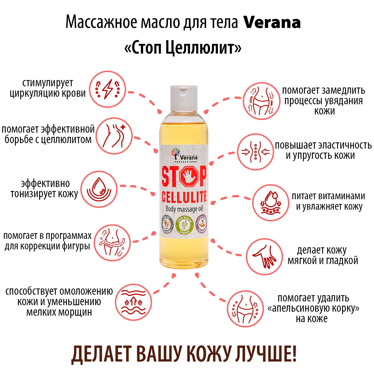 Состав:Натуральный масляный экстракт Вишни, масло из косточек Винограда, Рапсовое масло, Оливковое масло, Касторовое масло, Миндальное масло, Токоферол (природный витамин «Е»)Описание:Массажное масло для тела Verana Professional «Стоп Целлюлит» разработан