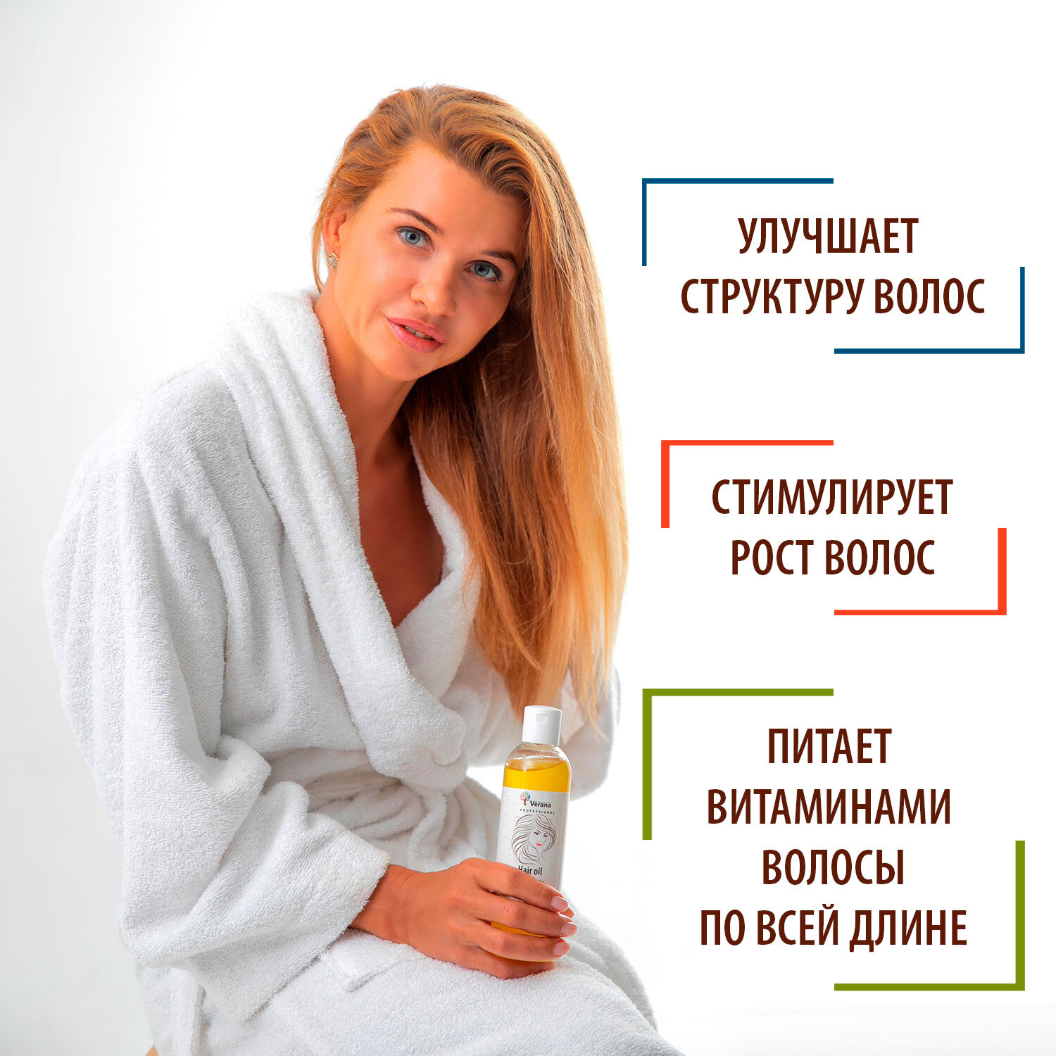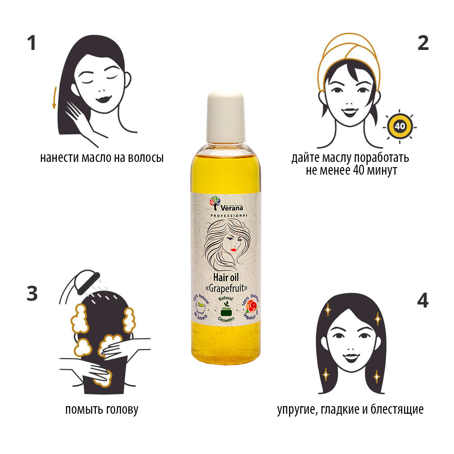 Состав:Масляные экстракты Прополиса, чёрного Перца, Крапивы, Каштана, Хмеля, Лопуха и Полыни, а так же эфирное масло Грейпфрут. Кокосовое масло, Кукурузное масло, Касторовое масло, Рапсовое масло, Подсолнечное масло.Описание:Масло для волос Verana Profess