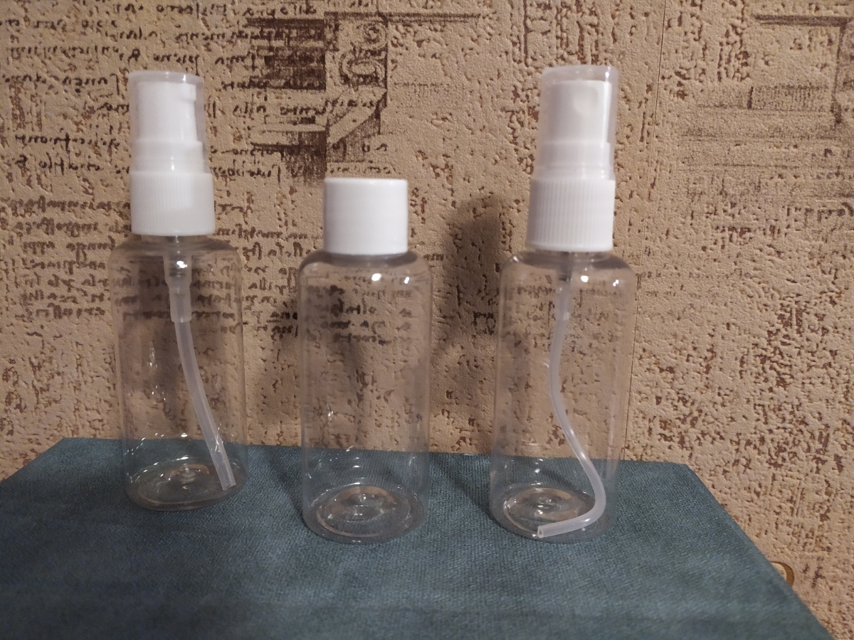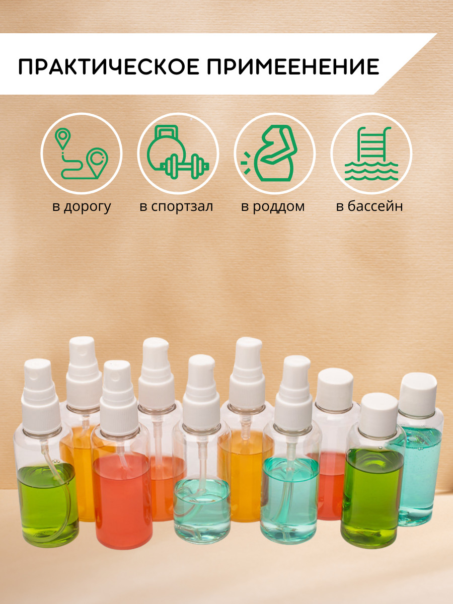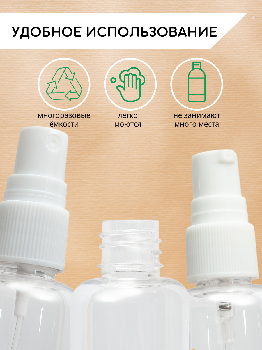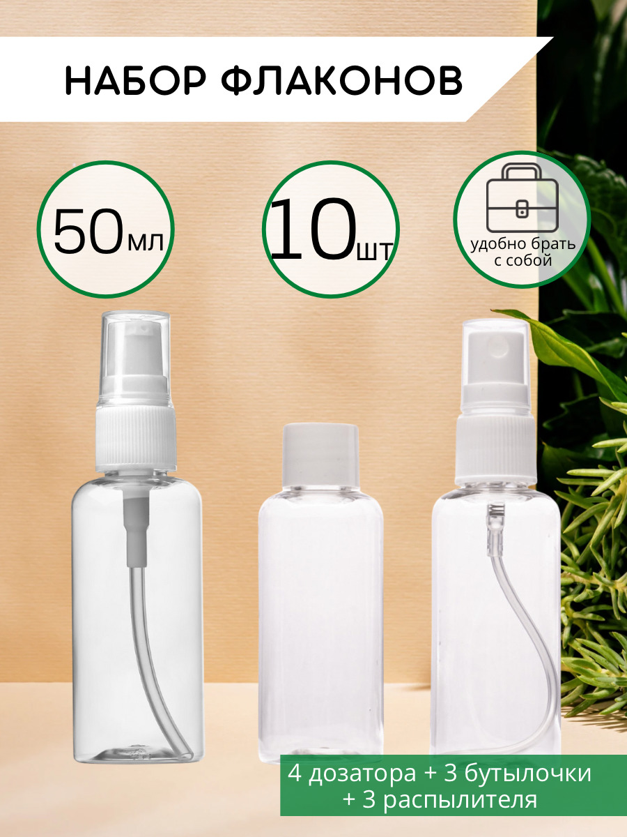 Комплектация:Бутылочка - 3 шт, распылитель - 3 шт, дозатор - 4 шт.
