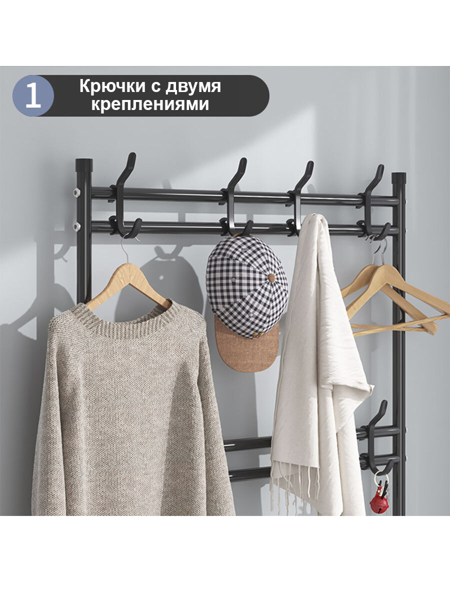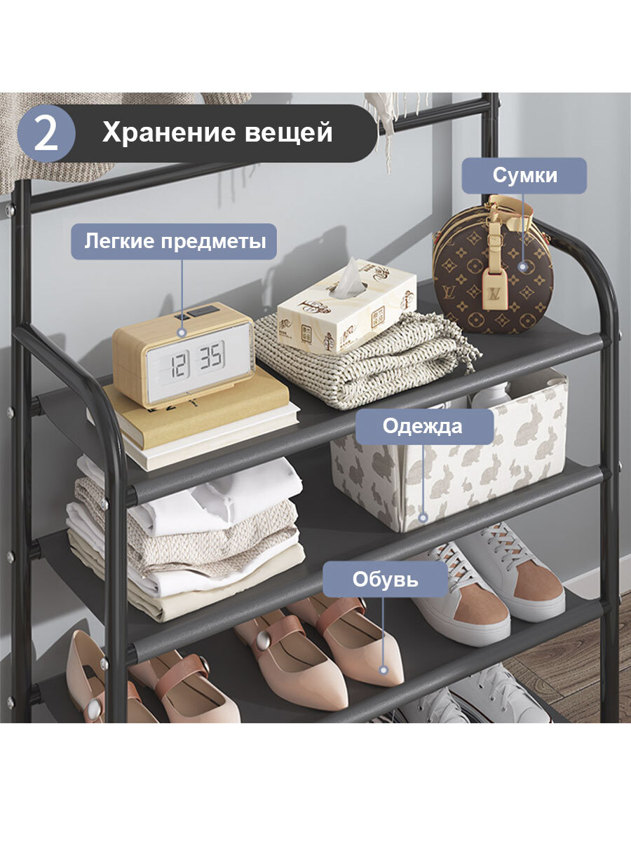 Комплектация:Вешалка;инструкция по сборкеОписание:Благодаря новой компактной вешалке теперь Вам будет удобно хранить все самое необходимое перед выходом из дома или офиса! Ее можно использовать в качестве хранения верхней одежды, стеллажа или обувщицы! В