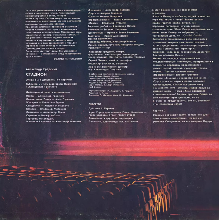Исполнитель: Александр ГрадскийОписание: "Стадион" - рок-опера Александра Градского на либретто Маргариты Пушкиной о государственном перевороте в Чили 1973 года и убийстве Виктора Хары.Состав исполнителей впечатляет: Александр Градский, Алла Пугачева, Анд