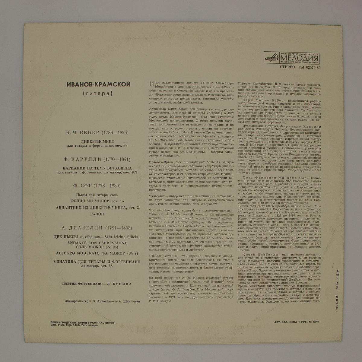 Комментарий:Дивертисмент для гитары и фортепиано, соч. 38A1 Andante Con Moto A2 Valse. Allegro A3 Variazioni. Andante A4 Frazioso -A5 Вариации фа мажор на тему Бетховена для гитары и фортепиано, соч. 169 Пьесы для гитары солоB1 Фолия Ми Минор, Соч. 15 B2