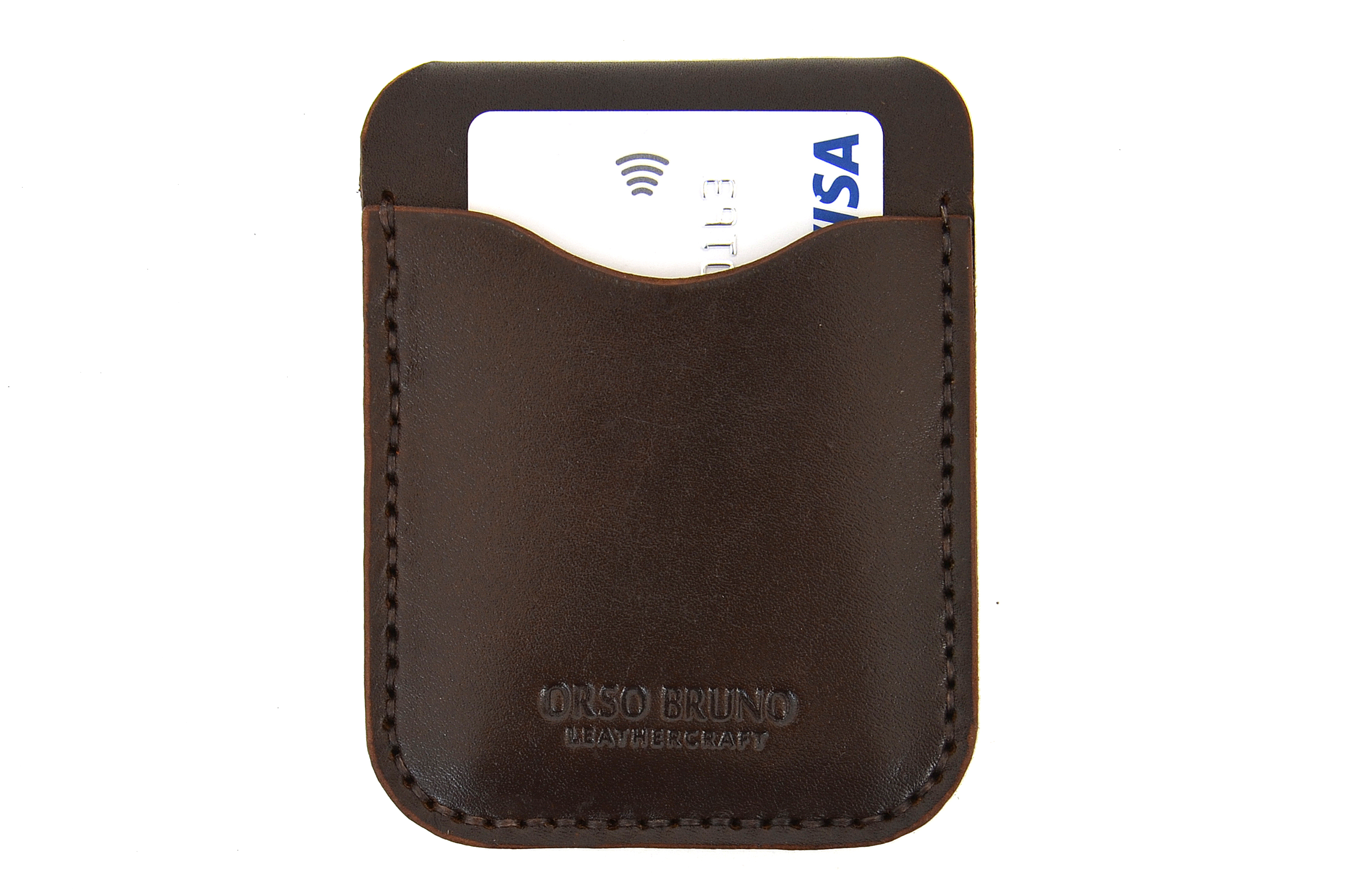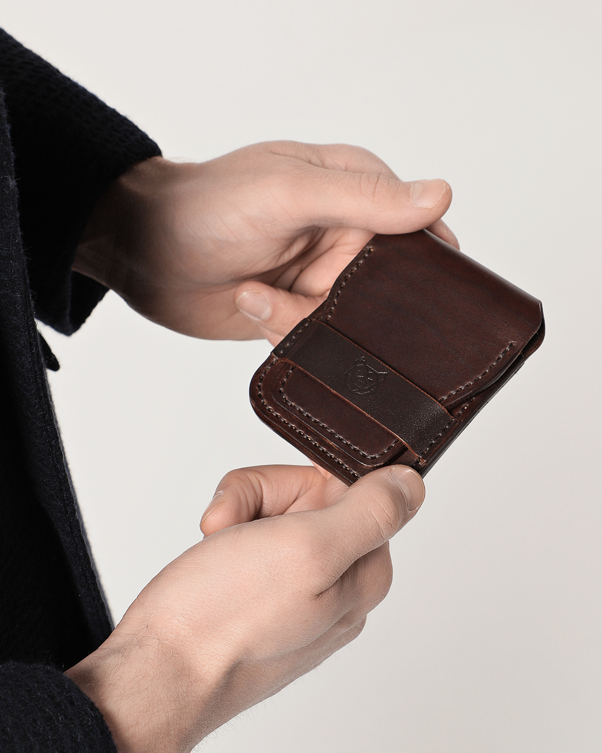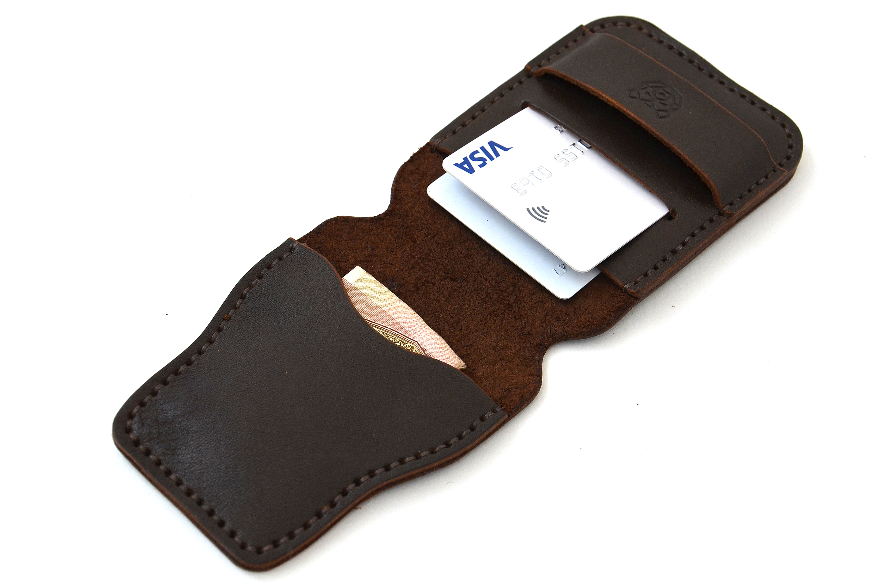 ORSO BRUNO - минималистичный кошелёк из натуральной кожи для карт и наличных.4 отделения - в каждом помещается 1 карта, надежный фиксатор из кожи.Ручная прошивка.Плотная кожа, толщиной 2 мм. Производство РФ, Беларусь.Торцы покрыты аппретурой и заполирован