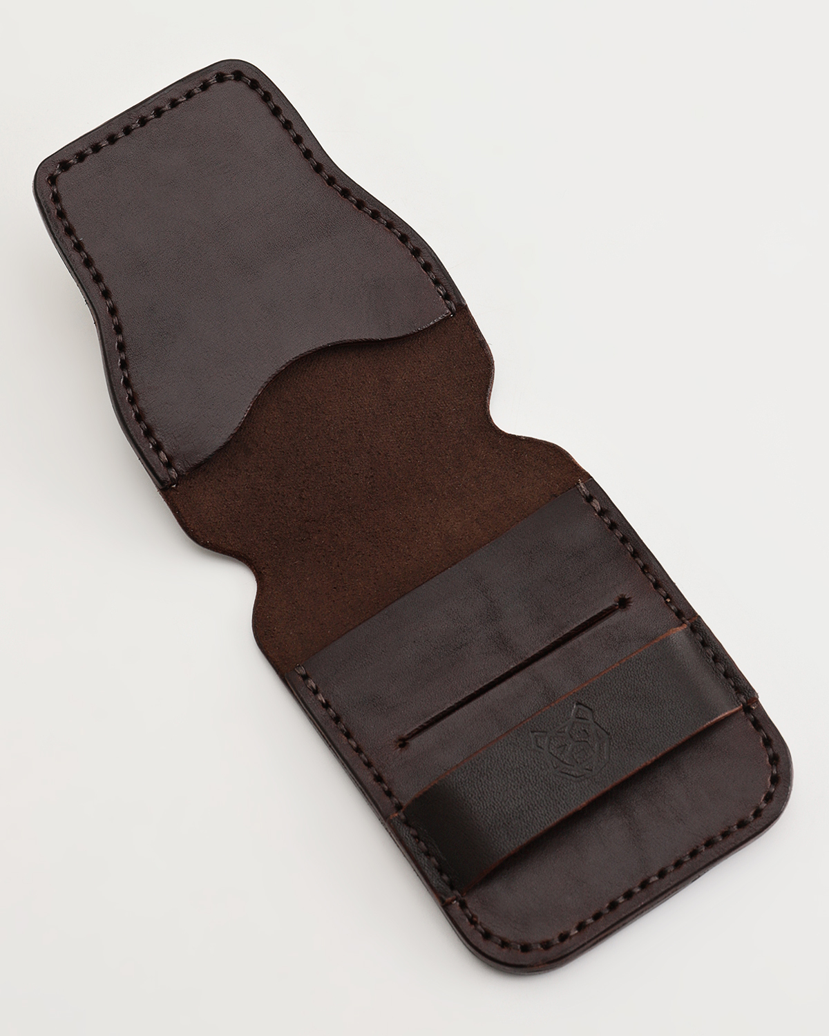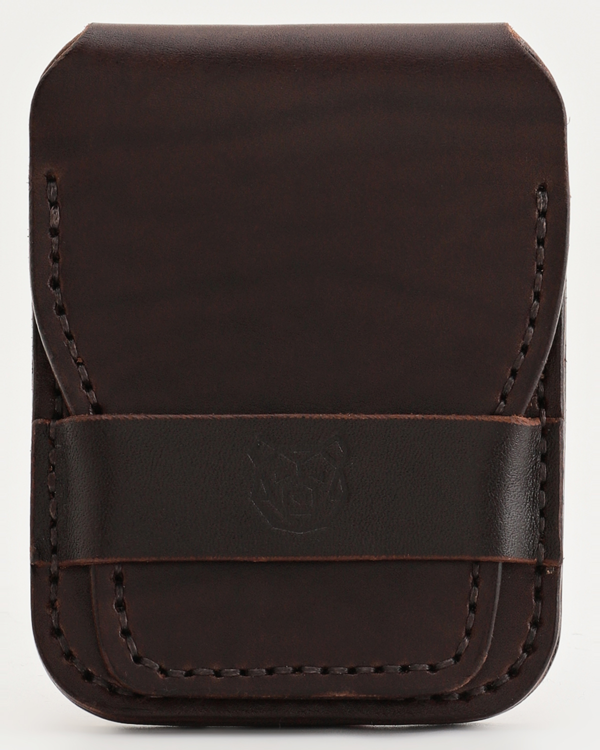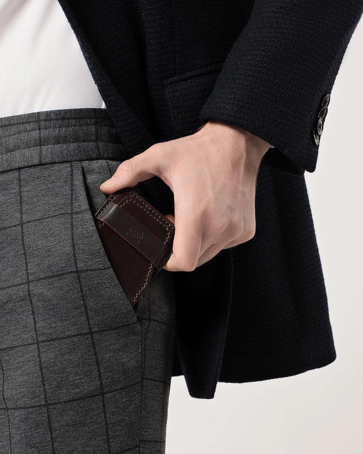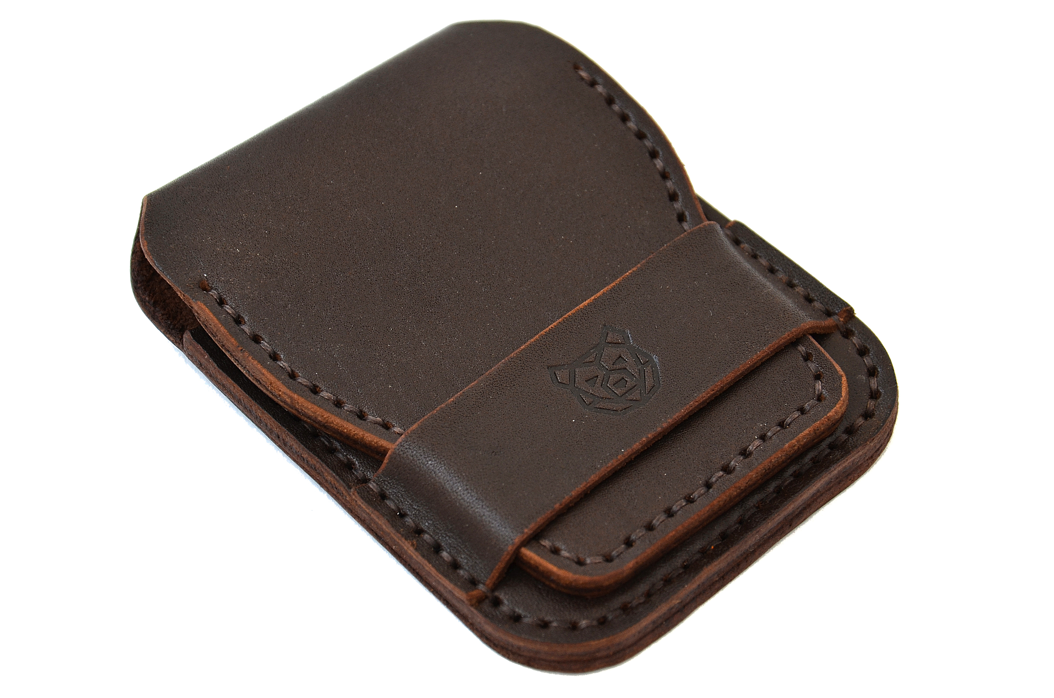ORSO BRUNO - минималистичный кошелёк из натуральной кожи для карт и наличных.4 отделения - в каждом помещается 1 карта, надежный фиксатор из кожи.Ручная прошивка.Плотная кожа, толщиной 2 мм. Производство РФ, Беларусь.Торцы покрыты аппретурой и заполирован