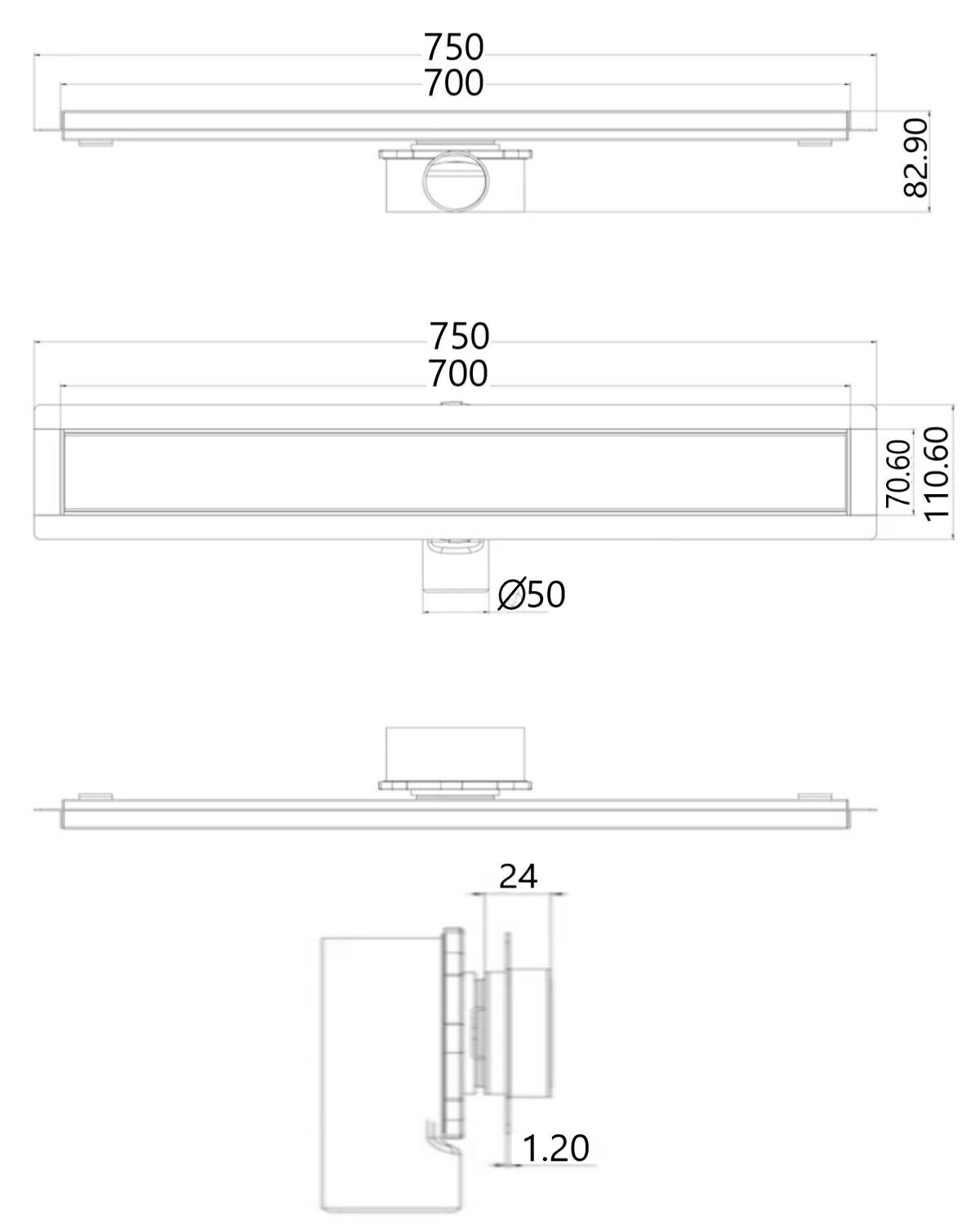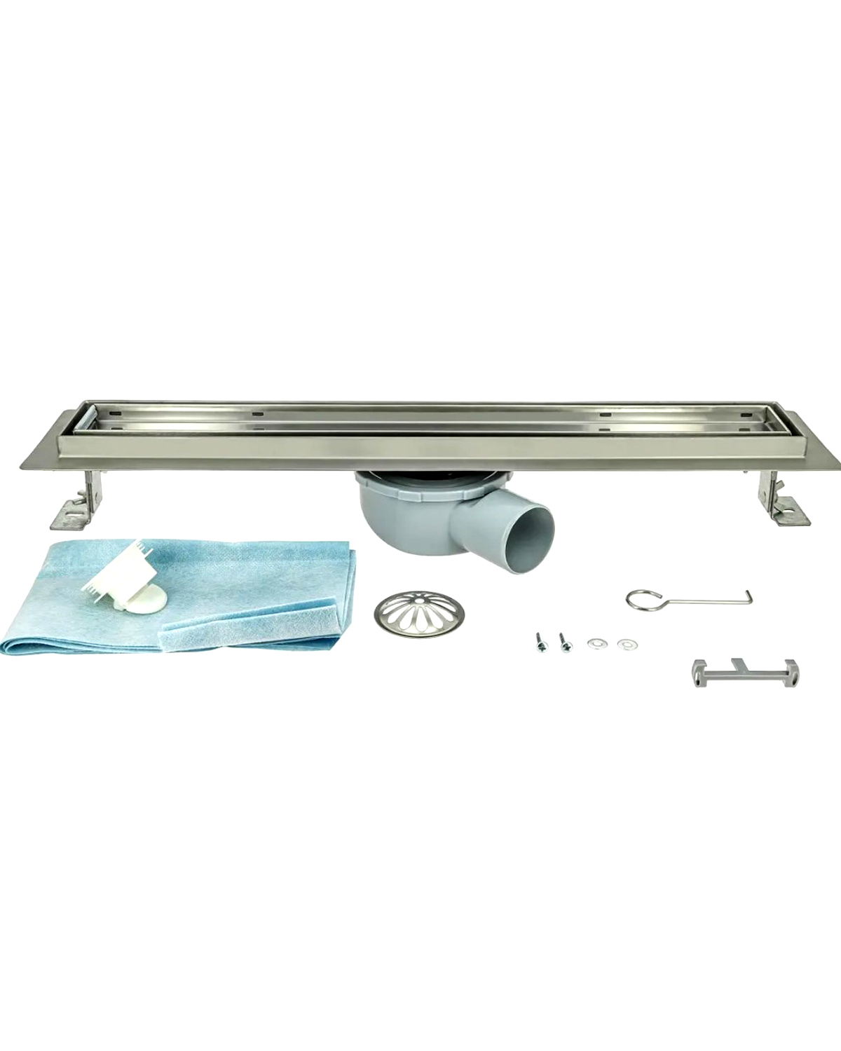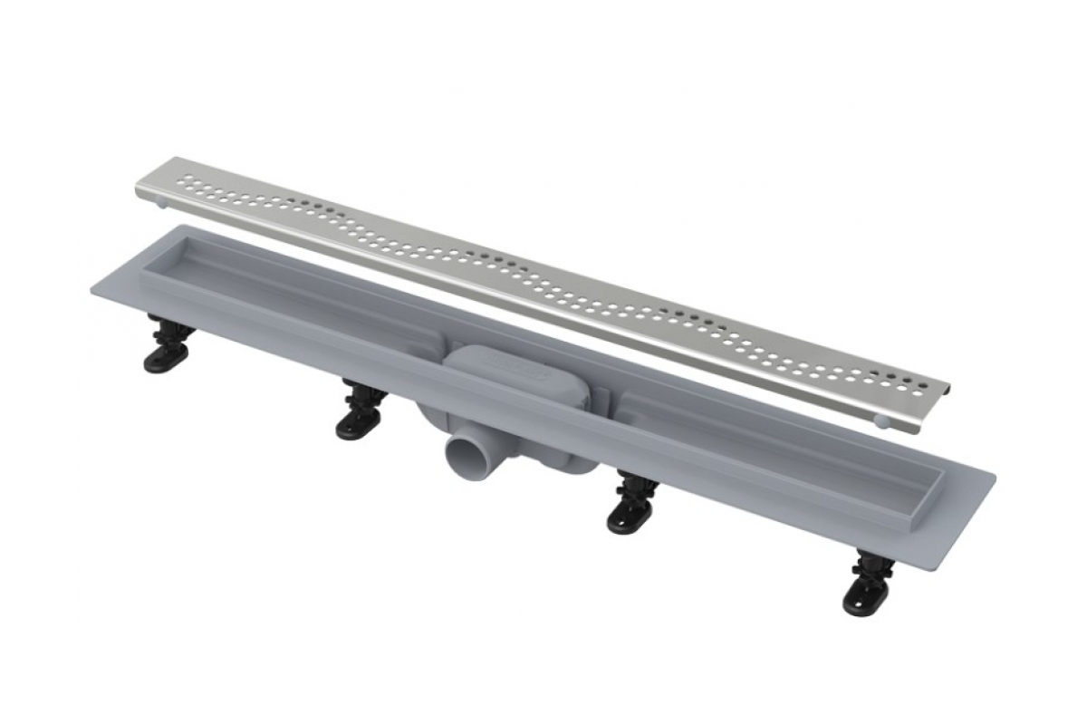 Комплектация:*Решетка, нержавеющая сталь AISI 304 3мм*Заглушка с сеткой для волос, AISI 304*Желоб водосток, AISI 304 *Фланец PP с гидроизоляцией*Самопромывной S-образный сифон РР: горизонтальный выпуск D50 H60, пропускная способность 48л/мин, монтаж 360°