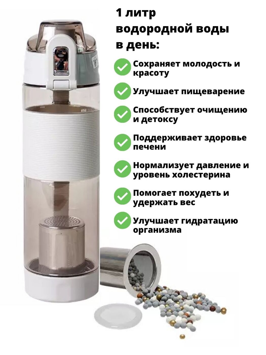 Комплектация:Бутылка-генератор водородной водыВ комплекте 2 сменных картриджаКомплекта минеральных шариков хватает на 500 использований (наполнений водой)Описание:Водородная бутылка генератор водородной воды Hydro Bottle 2YOUNG обогащает воду молекулярным