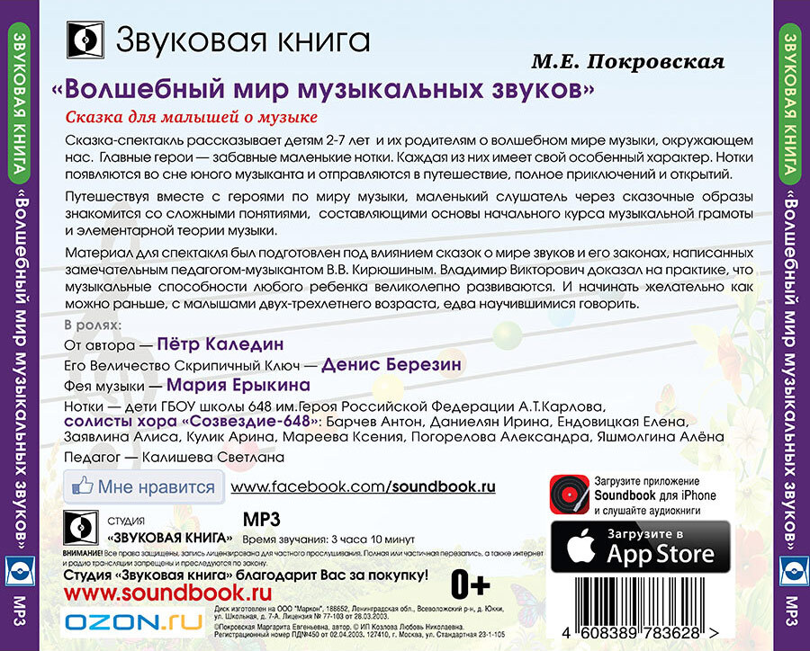 Комментарий:Общее время звучания: 3 часа 10 минут.Описание:Эта сказка написана и озвучена актерами чтобы привлечь внимание детей 4-9 лет и их родителей к многогранному миру музыки. Увлекательно и доступно для детского восприятия сказочными образами предст