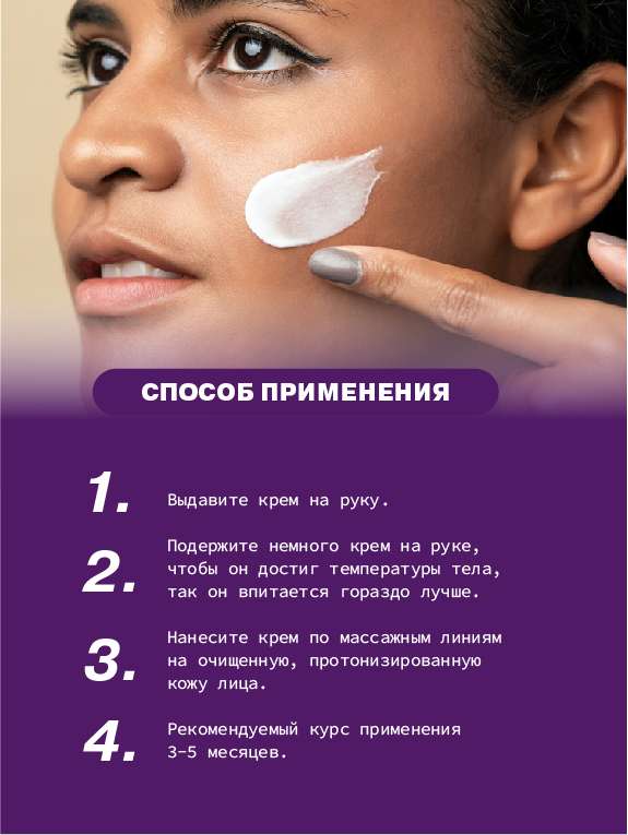 Способ примененияНаносить на очищенную протонизированную кожу. Рекомендуемое время использования: вечер. Использовать курсом 3–5 месяцев.